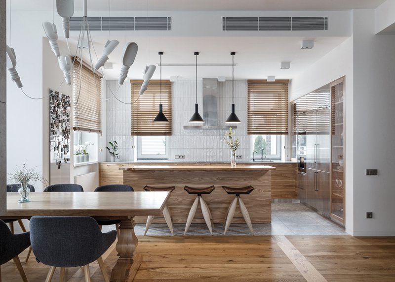 Просторная гостиная объединена со столовой и кухней. В рабочий кабинет ведет «потайная» дверь у окна: полотно отделано тем же шпоном, что и стена, поэтому почти незаметно. В центре опен спейса — камин. Он ориентирован на три стороны, так что живым огнем можно любоваться из любой точки.
