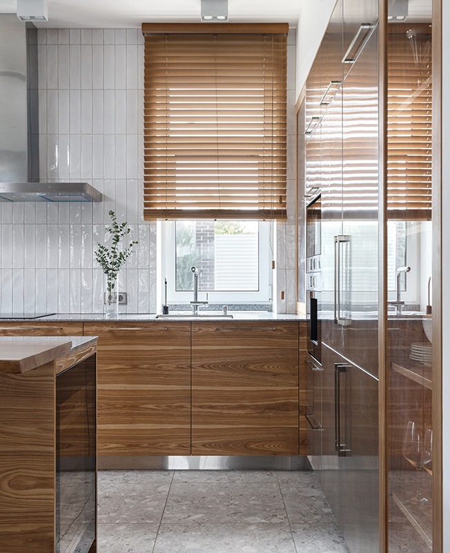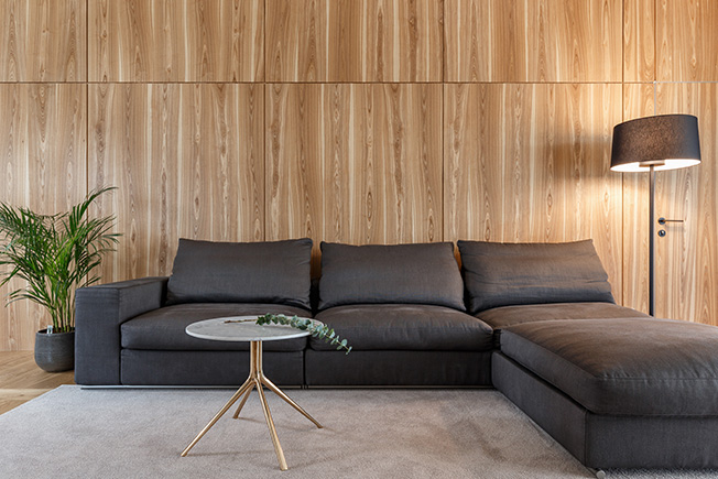 Отделка дома выполнена из природных материалов или таких, что достоверно их воспроизводят. Тон задают шпон ясеня и керамогранит «под камень» марки Cerim — теплые и холодные фактуры проявляют красоту друг друга, их соотношение оптимально. Мягкая натуральная палитра разбавлена глубокими оттенками текстиля.