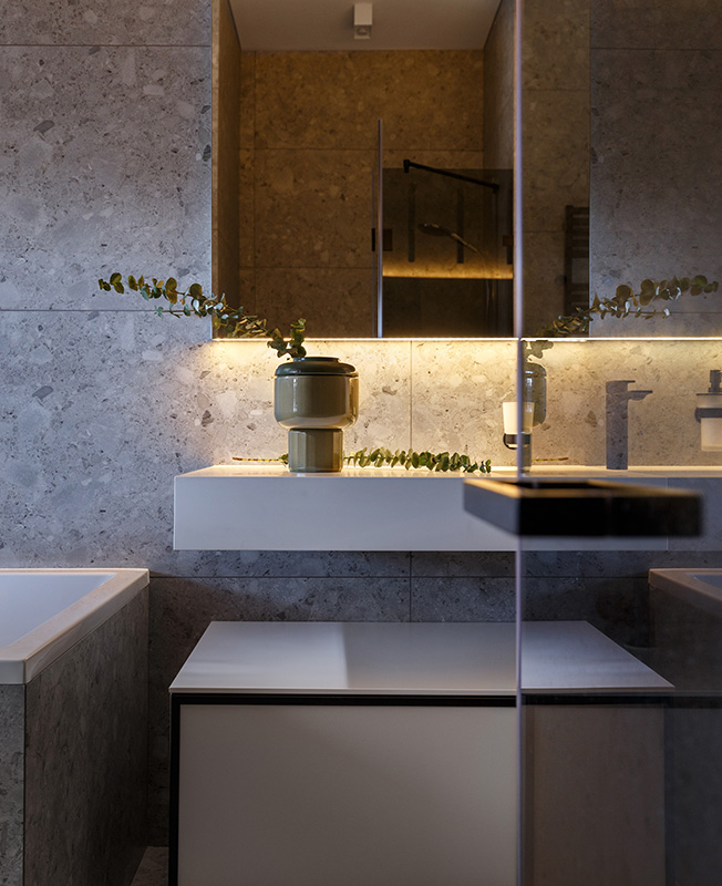 Как и во всех проектах SVOYA studio, здесь много предметов индивидуального изготовления. Кухня, обеденный стол, прикроватные тумбы, рабочий стол в кабинете, оригинальные барные табуреты — всё выполнено специально для проекта. «Следуя принципу «от общего к частному», мы уделяем внимание деталям, активно развивая направление предметного дизайна», — говорят авторы.