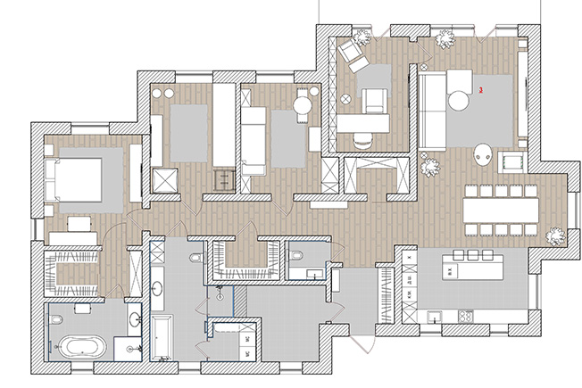 В гостиной представлена мебель лучших итальянских брендов. Диван от Flexform, столик Poliform и тумба под ТВ Molteni&C — образцы элегантной роскоши. Люстра Karman Italia над обеденным столом вносит динамику в спокойный интерьер.