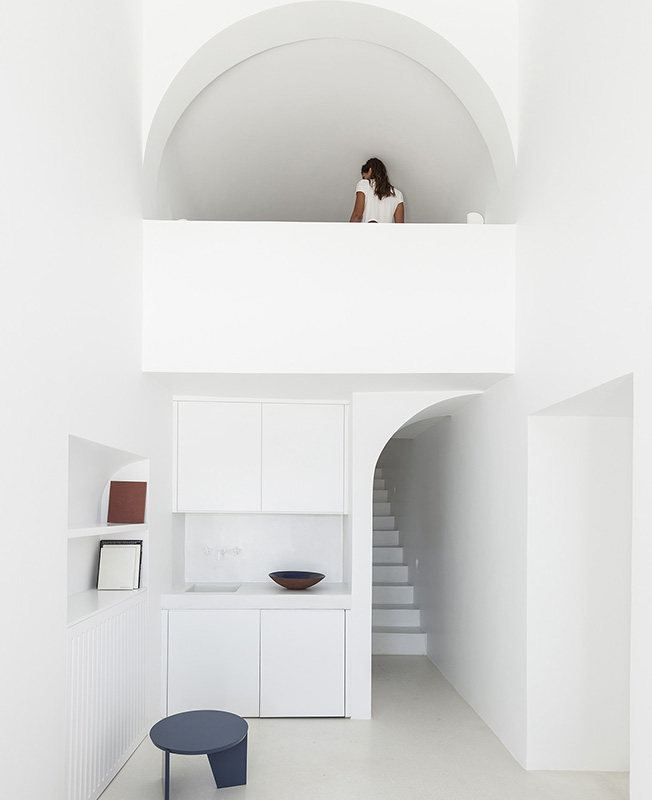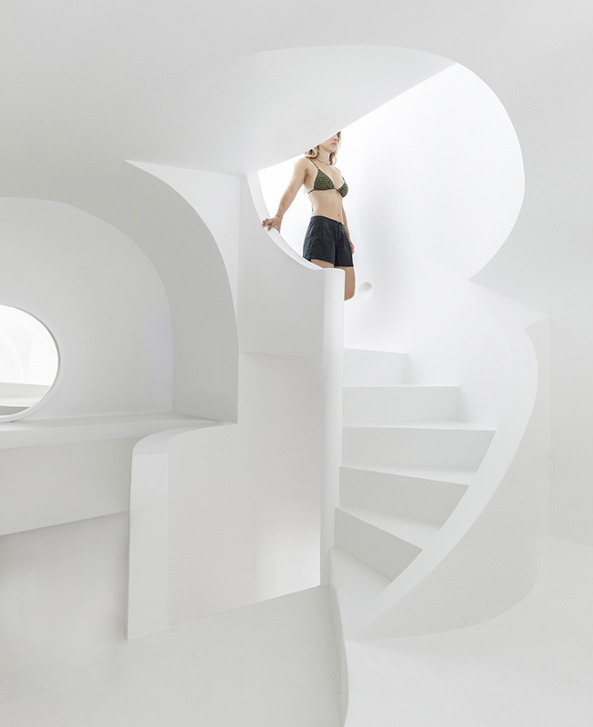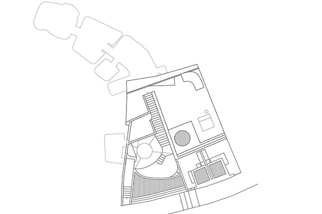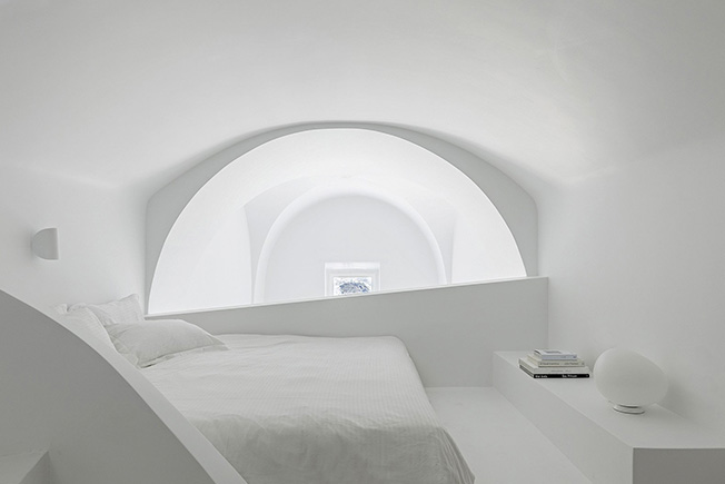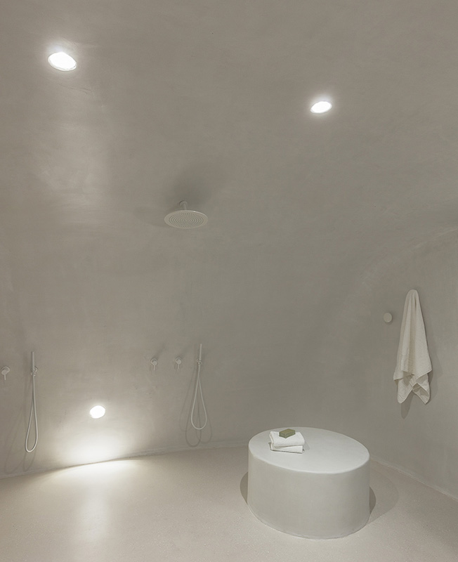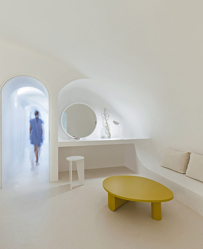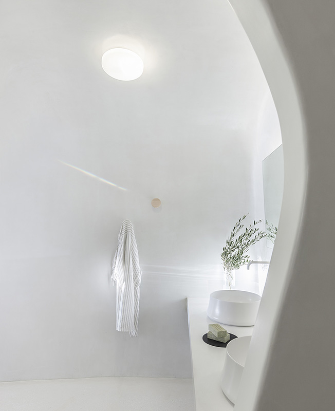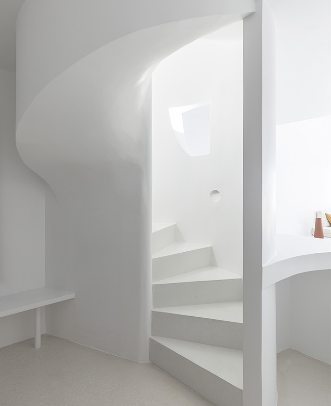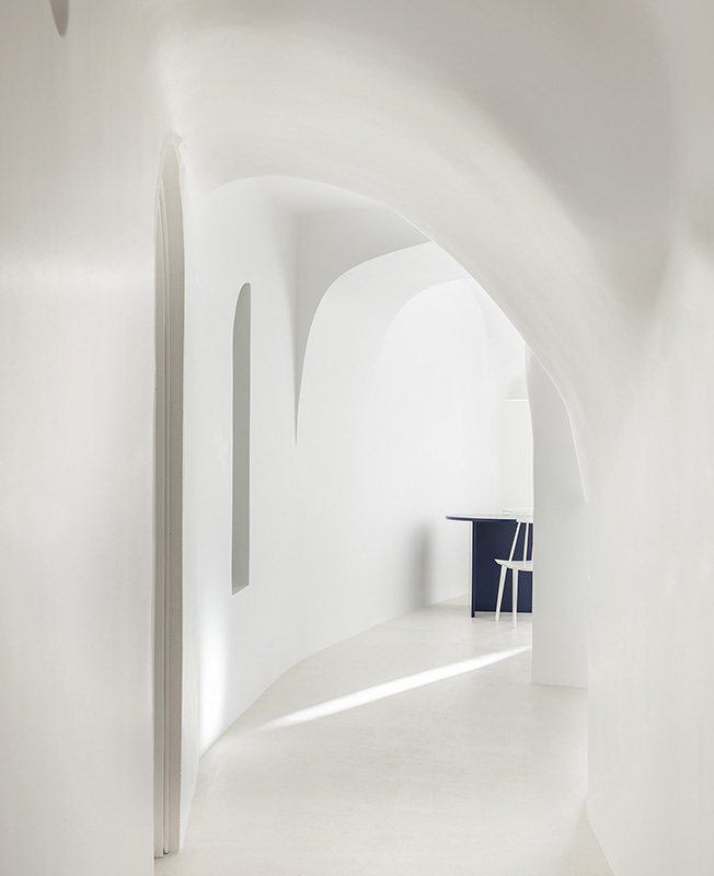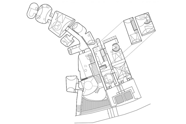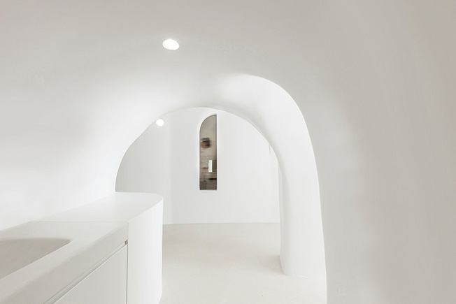 Криволинейные стены и сводчатые потолки определяют интерьер. Они резко контрастируют с жесткими углами, из которых состоят открытые террасы и лестницы.