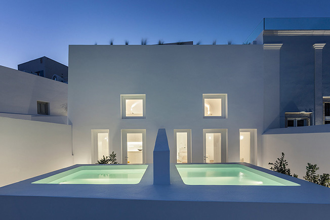 Бывший склад представлял собой длинную узкую структуру, Kapsimalis Architects превратили ее в современный комплекс, состоящий из нескольких отдельных блоков с террасами, бассейнами и площадками для отдыха. У бассейнов устроены обеденные зоны, тенты защищают от палящего солнца.