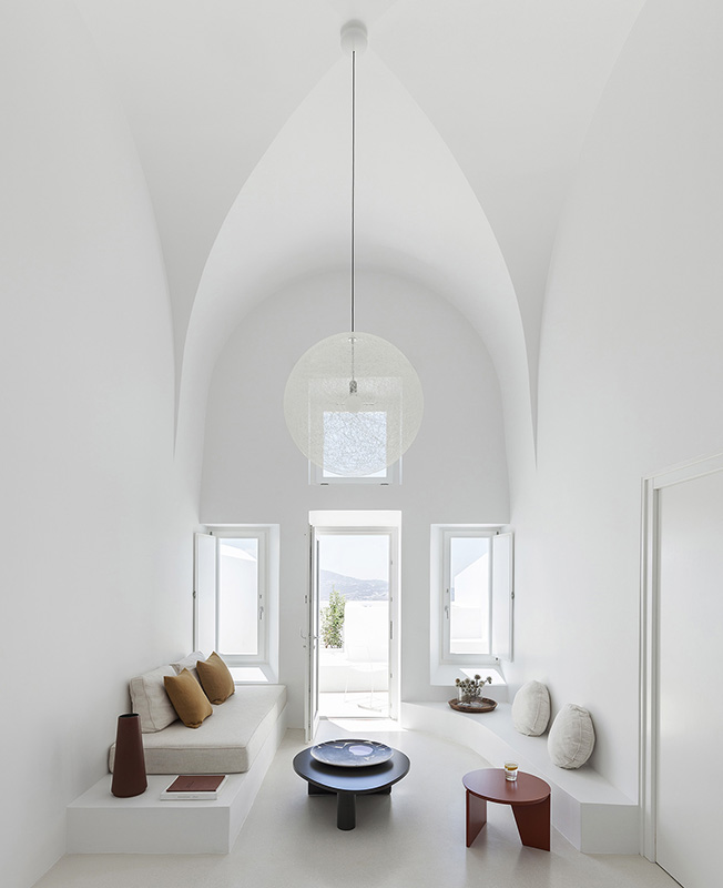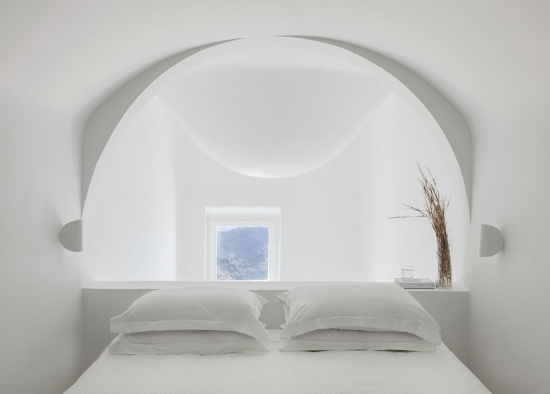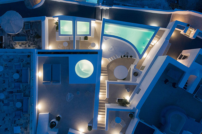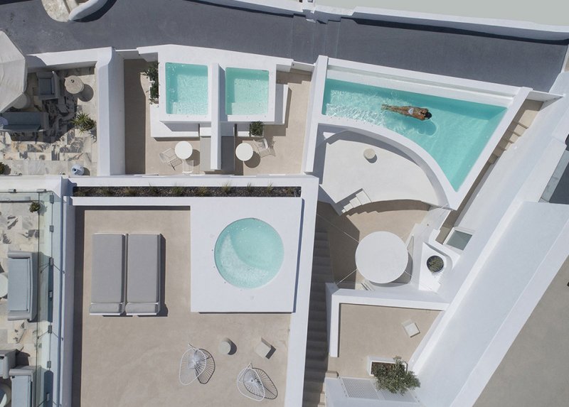 Если смотреть сверху, то резиденция напоминает лабиринт. Разнообразие пространств поддерживает визуальный интерес на каждом шагу. Однако не отвелекает от главной достопримечательности — просторов Эгейского моря.