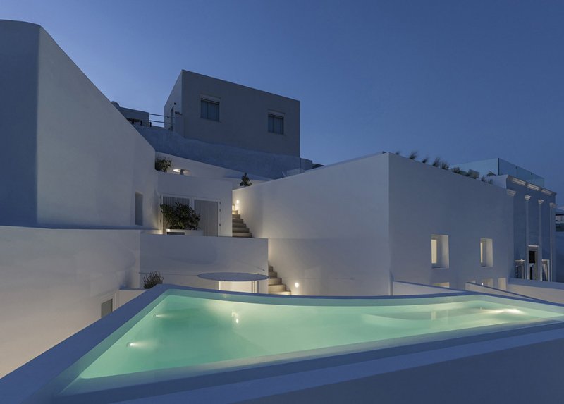 Архитекторы бюро Kapsimalis Architects провели реконструкцию на Санторини, в деревне Имеровигли: бывшее складское здание превратили в летнюю резиденцию. Греческий остров Санторини — одно из самых романтичных мест на земле. Здесь модно устраивать свадьбы и проводить медовый месяц. Остров славится пейзажами, невероятно яркими закатами и пляжами с вулканическим песком. Не меньше впечатляет архитектура. Старые белые дома с синими крышами, лепящиеся на скалах, известны по многочисленным фотографиям в инстаграме, и в жизни они оказываются такими же «инстаграмными». Как в таком самобытном месте создать жилище, которое несет в себе традиционный стиль, в то же время расширяет его выразительные возможности? Бюро Kapsimalis Architects базируется и много строит на Санторини — его участники знают ответ. «Грубый вулканический ландшафт, смена пейзажей, разнообразие материалов, старая архитектура и изменчивые погодные условия оказывают огромное влияние на процесс проектирования, — рассказывают авторы. — Каждое наше архитектурное решение связано с окружающей средой. Особенности и проблемы этого острова — искра, которая порождает яркие формы. Мы стремимся сделать здания неотъемлемой частью ландшафта». Бывший склад представлял собой длинную узкую структуру, Kapsimalis Architects превратили ее в современный комплекс, состоящий из нескольких отдельных блоков с террасами, бассейнами и площадками для отдыха. У бассейнов устроены обеденные зоны, тенты защищают от палящего солнца. Если смотреть сверху, то резиденция напоминает лабиринт. Разнообразие пространств поддерживает визуальный интерес на каждом шагу. Однако не отвелекает от главной достопримечательности — просторов Эгейского моря. Криволинейные стены и сводчатые потолки определяют интерьер. Они резко контрастируют с жесткими углами, из которых состоят открытые террасы и лестницы. Мебели минимум, в основном она встроенная, но ее достаточно для комфорта. Ведь основную часть времени обитатели резиденции проводят на свежем воздухе. Бюро Kapsimalis Architects основали выпускники Национального технического университета в Афинах, архитекторы Александро Капсималис (р. 1986) и Марианна Капсимали (р. 1988). На их счету немало интересных проектов на греческом острове: частные виллы, отели, обновленные винодельни и даже реконструкция церкви Святого Иоанна.