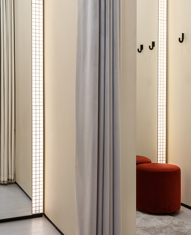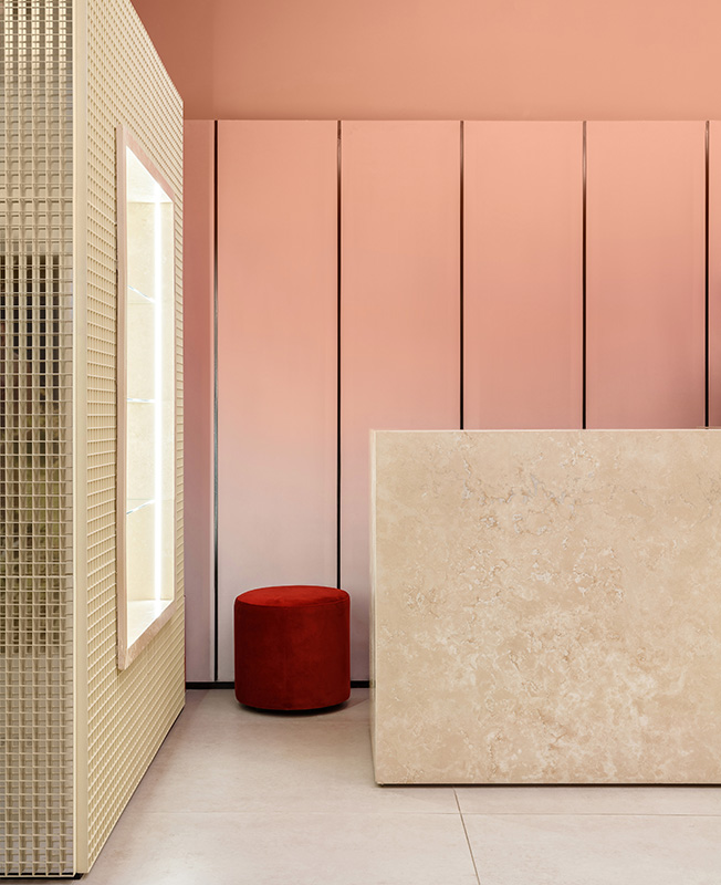 Настенные панели декорированы модным градиентом и демонстрируют плавный переход от розового к светло-серому, второму основному цвету интерьера. Третий цвет — нежно-желтый появляется в рейлах, травертине на стойках и витринах. Акцентом выступает эффектный бордовый пуфик, он символизирует логотип бренда — красные губы.