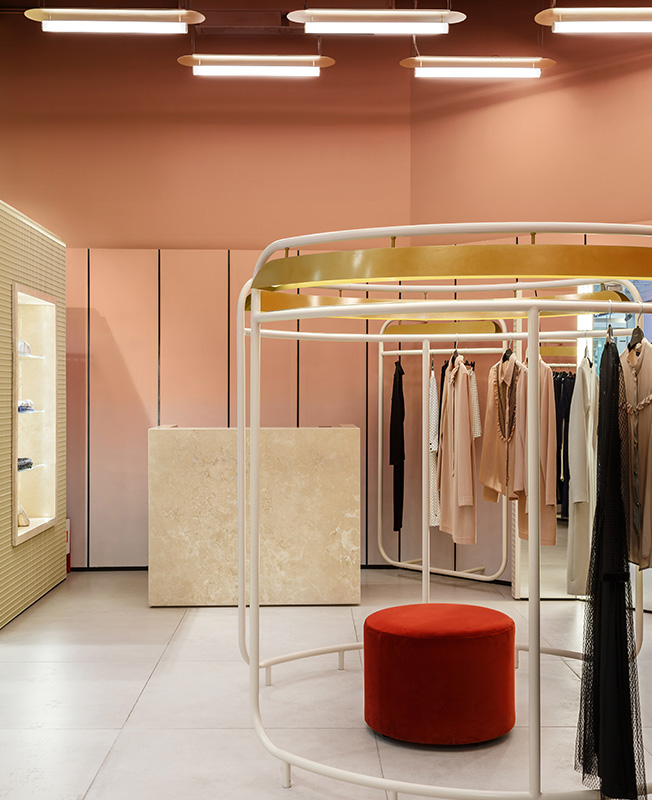 Пудрово-розовый и желтый, точеные изгибы светильников, бархатные пуфы отсылают к женственному началу. Им противостоят металлическая сетка витрин и конструкции рейлов, похожие на строительные леса, которые ассоциируются с мегаполисом. Жесткий ритм светильников на потолке олицетворяет скорость и решительность.