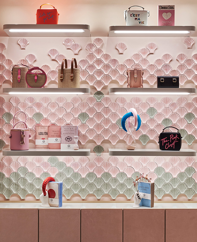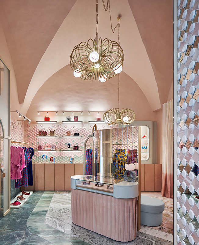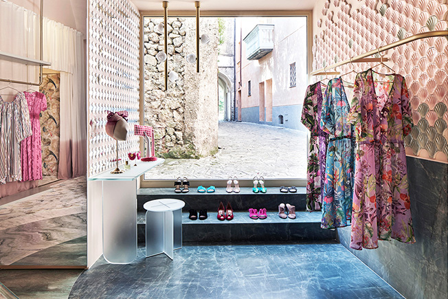Кристина Челестино оформила фирменный бутик Pink Closet в Palazzo Avino. Бутик находится в нескольких метрах от входа в отель. Переступив его порог, вы словно чувствуете себя в розовом гроте с отблесками моря, которые исчезают в глубине. Челестино, в очередной раз, предлагает захватывающй визуальный и тактильный опыт.