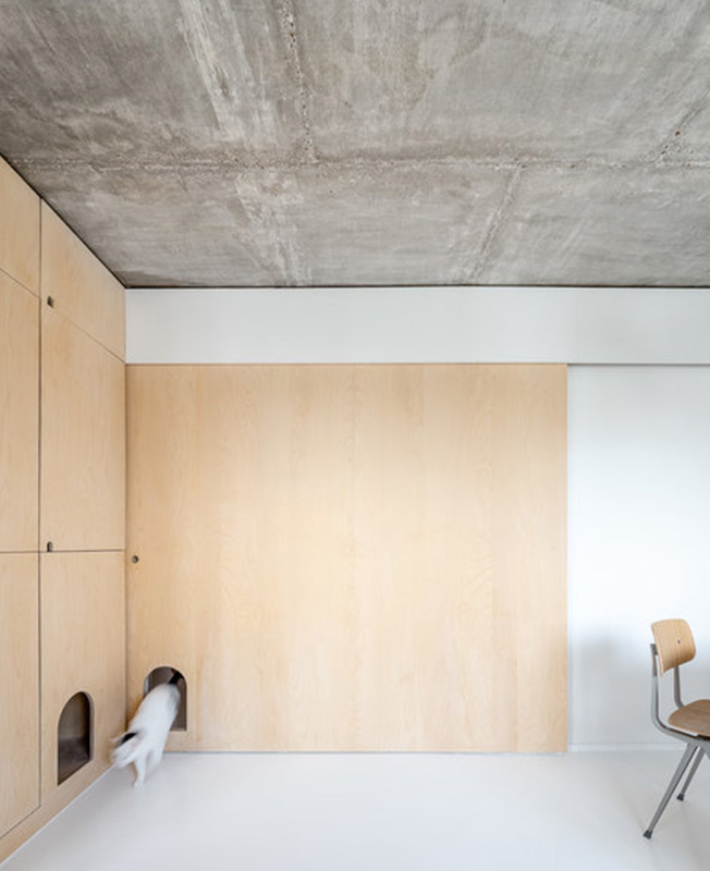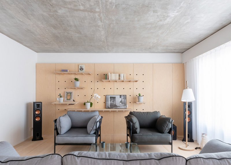 Оттенок березовой фанеры определил палитру квартиры, его дополняют серый тон бетона, а также холодный белый. Всплески цвета крайне редки, например, в столовой внимание притягивают красные, синие и желтые провода свисающей с потолка люстры. Важный источник цвета — вещи хозяев, прежде всего книги.