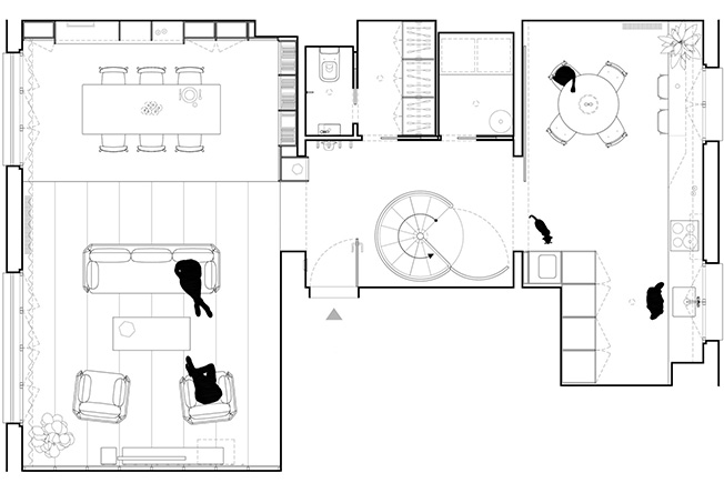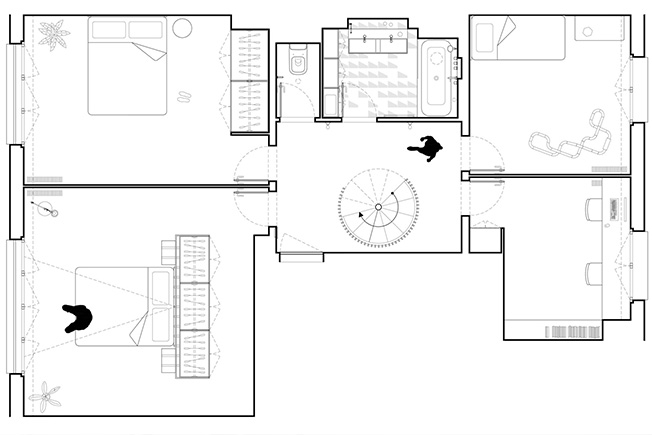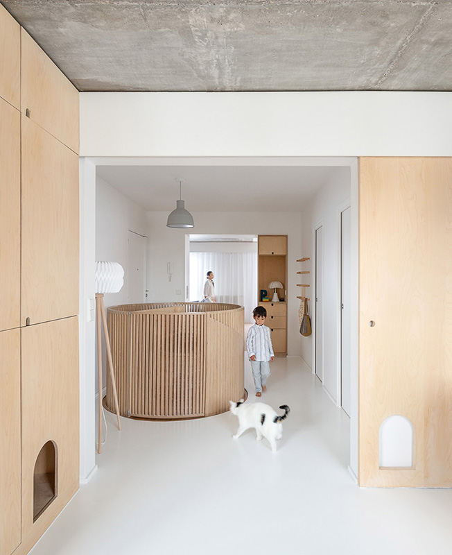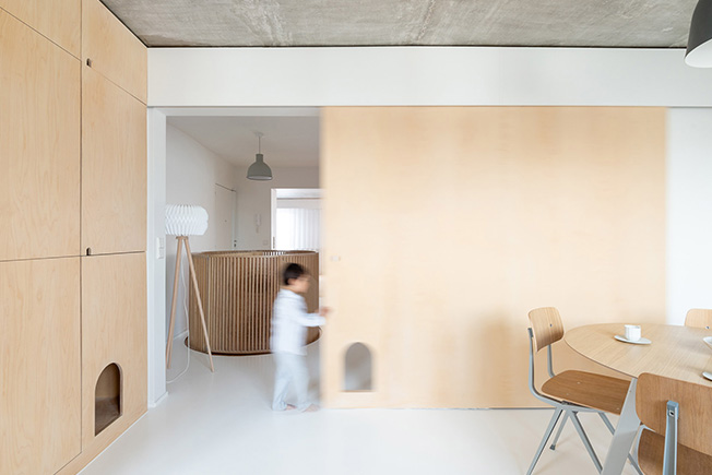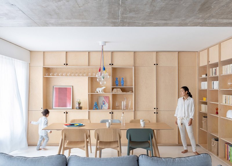 Архитекторы студии Sabo Project обновили дуплекс в пятом округе Парижа. Главный материал интерьера — березовая фанера. Авторам предстояло реконструировать просторную, 154 кв. метра, но запущенную двухуровневую квартиру — сделать ее более подходящей для молодых хозяев и безопасной для их ребенка. Преобразования они начали с того, что расчистили коробку: сняли полы, подвесные потолки и желтую ткань со стен — предыдущие владельцы придерживались «традиционных ценностей». Березовую фанеру очень любили классики модернизма, особенно скандинавы. Заказчикам понравилась идея: использовав недорогой, но знаковый материал, создать уникальный авторский интерьер, бросив вызов показной роскоши. Важно и то, что повсеместное присутствие фанеры способствует цельности проекта. На верхнем уровне — опен спейс гостиной-столовой. Зонирование осуществляется покрытиями: голый бетон на потолке сменяется белой краской, дощатый пол переходит в наливной. В стены встроены шкафы из фанеры, вместо ручек — аккуратные выемки. Глухие отсеки разбавлены открытыми полками, на которых хозяева выставляют произведения искусства, книги, предметы декора. Одна из стен обшита листами фанеры с круглыми отверстиями: они выглядят своеобразным декором и дают возможность интегрировать навесные полки. Гостиную-столовую можно закрыть раздвижной перегородкой, опять-таки из фанеры, а чтобы домашний питомец, белый кот, свободно курсировал по дому, в перегородке сделано сводчатое отверстие. Еще одно такое же отверстие — вход в домик, где кот спит. Кухня также укомплектована мебелью из фанеры. Встроенные модули накрыты столешницей, расположенной довольно высоко, на уровне подоконника. Она служит в том числе и барной стойкой, сидя за которой, приятно смотреть в окно. Стулья подобрали из древесины, максимально близкой по тону к фанере. Оттенок березовой фанеры определил палитру квартиры, его дополняют серый тон бетона, а также холодный белый. Всплески цвета крайне редки, например, в столовой внимание притягивают красные, синие и желтые провода свисающей с потолка люстры. Важный источник цвета — вещи хозяев, прежде всего книги. Спальни расположены на более тихом нижнем уровне. Туда ведет лестница. Обычно это главный источник тревог в доме, где есть маленькие дети, но в данном случае дизайнеры оснастили конструкцию съемными защитными воротцами. Студию Sabo Project основал в 2010 году Алекс Делоне. Сегодня у нее есть офисы в Париже и Нью-Йорке. На счету студии несколько престижных премий, в том числе 40 under 40 Award для перспективных молодых архитекторов Европы.