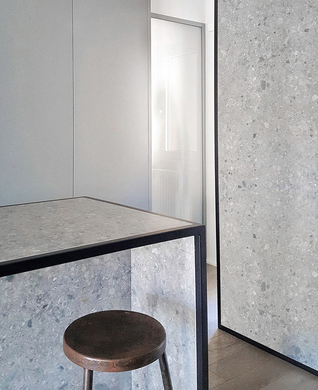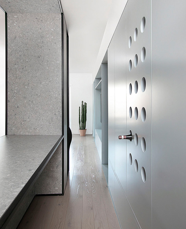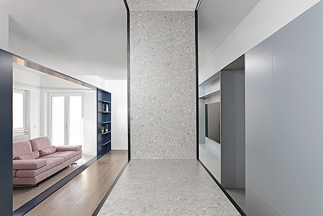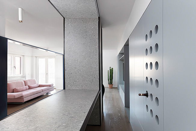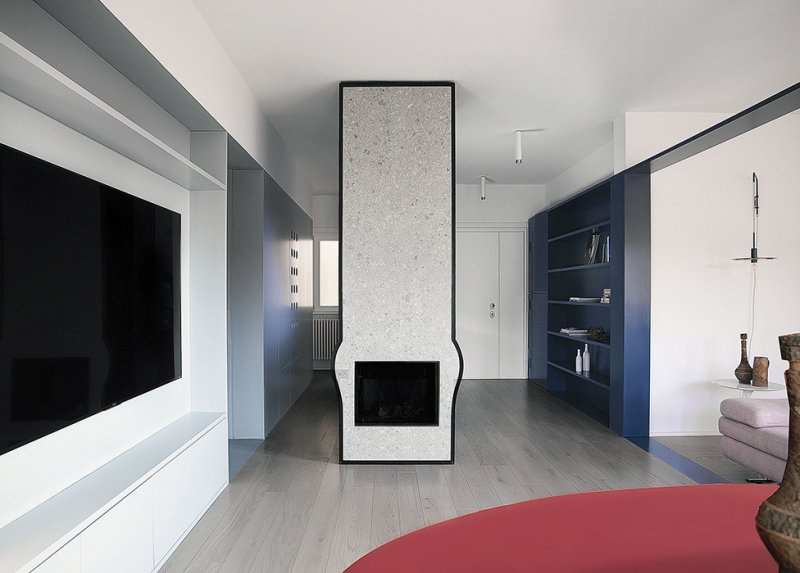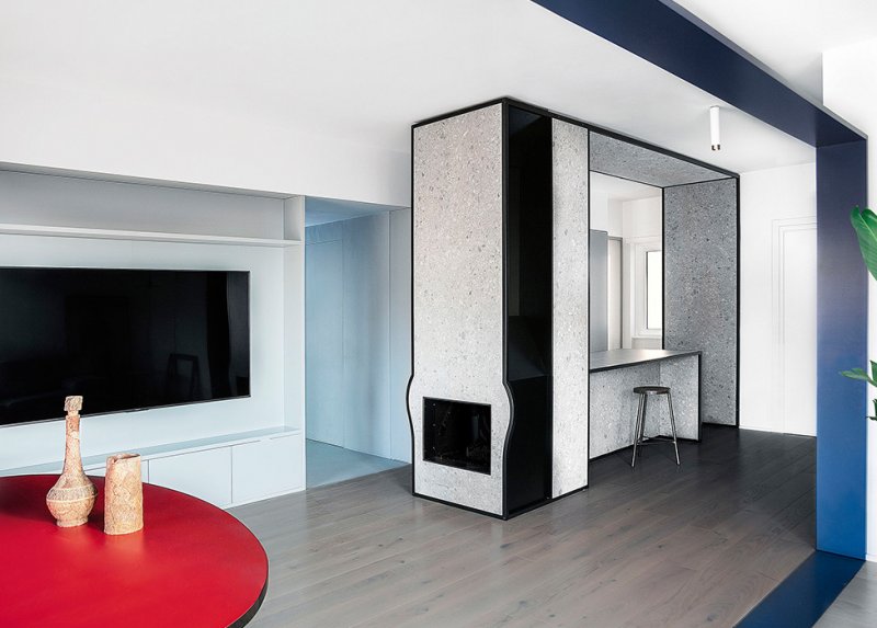 Архитекторы MGK Architects реконструировали квартиру в Альбано-Лациале, городе в 25 км к югу от Рима. Площадь объекта: 110 кв. метров. Квартира находится в здании, построенном в 1970-х. Исходная планировка была типичной для того времени: мелкие комнаты и коридоры. Опен спейсы еще не вошли в моду. Несмотря на то, что квартира ориентирована на четыре стороны, светлой ее назвать никак было нельзя — перегородки препятствовали продвижению света. Архитекторы начали с того, что снесли все внутренние стены, которые можно было снести. В центре освобожденного пространства спроектировали модуль, разместив в нем кухню, ванные и постирочные — помещения, которым дневной свет не требуется. Такая планировка сделала пространство светлым и современным, позволила четко отделить общественную зону от спален. Линейность центрального модуля прерывается тремя проходами. Один — в центре, сквозной, соединяет гостиную со спальней. Два боковых закрыты сатинированным стеклом. Чтобы повысить функциональность, по периметру модуля добавили изготовленные на заказ корпусные элементы: книжный стеллаж, шкаф, бар. Гостиную, определяет разработанный архитекторами специально для проекта многофункциональный элемент. Выполненная из металла конструкция включает камин, барную стойку и гардероб. Необычность цветовой палитры в том, что к традиционным индустриальным цветам архитекеторы добавили насыщенные синий и красный. Эти же цвета представлены в интерьере в в смягченном вариатне — голубом и розовом. Основные материалы интерьера: черный металл, дубовый паркет и камень. Достижение архитекторов — гармоничное сочетании современного и винтажного. «Исторические» предметы обстановки поставила компания Oh my lab. Такой подход усложняет драматургию, придает проекту многослойность Студию MGK Architects основал в 2005 году Мохамед G. Кейлани — его инициалы дали название бренду. Позже к Кейлани присоединилась Клаудиа Фамильетти. Студия работает в Италии и странах Ближнего Востока. В портфолио — виллы, апартаменты, рестораны. Особым своим достижением авторы считают эксперименты с материалами.