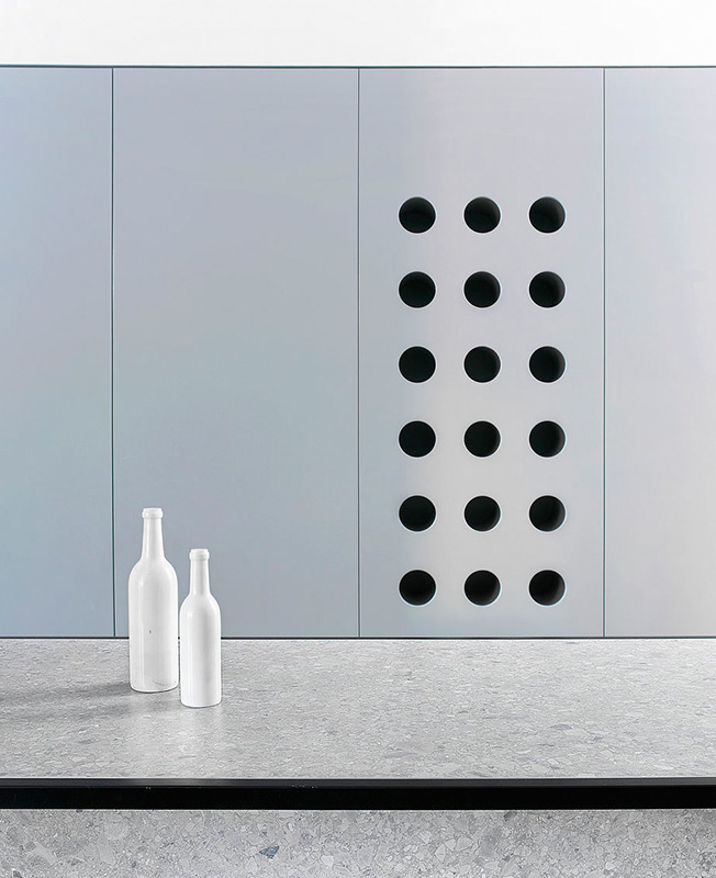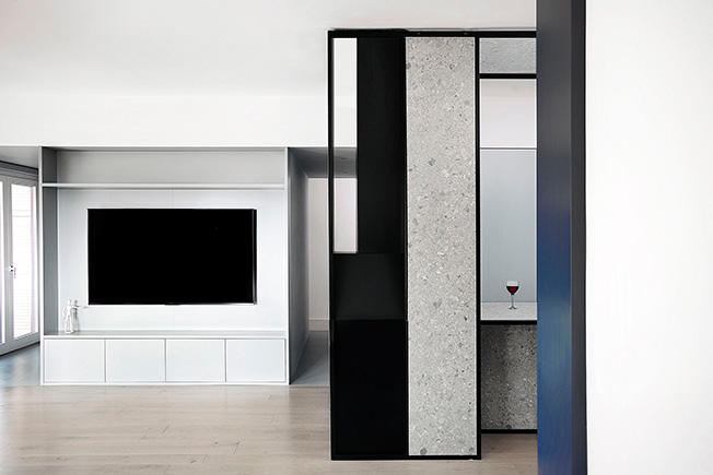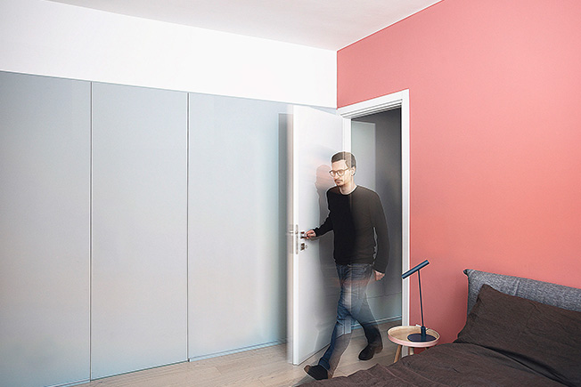 Линейность центрального модуля прерывается тремя проходами. Один — в центре, сквозной, соединяет гостиную со спальней. Два боковых закрыты сатинированным стеклом. Чтобы повысить функциональность, по периметру модуля добавили изготовленные на заказ корпусные элементы: книжный стеллаж, шкаф, бар.