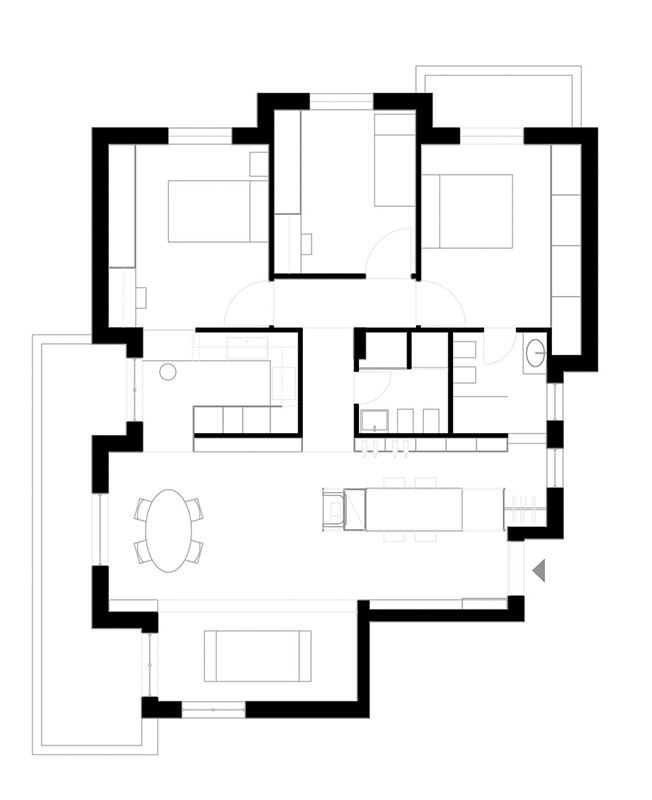 Архитекторы начали с того, что снесли все внутренние стены, которые можно было снести. В центре освобожденного пространства спроектировали модуль, разместив в нем кухню, ванные и постирочные — помещения, которым дневной свет не требуется. Такая планировка сделала пространство светлым и современным, позволила четко отделить общественную зону от спален.