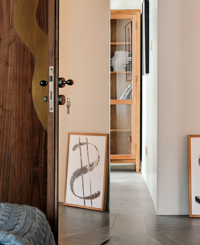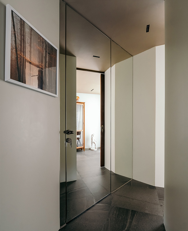 В самом большом помещении мы установили под точно высчитанным углом систему шкафов и зеркал, она же стала стартовой точкой для раздвижной дверь в кухню. Это не только изменило отношения между гостиной, кухней и столовой, но также существенно расширило пространство и добавило значительное количество непрямого света. Раздвижная дверь перемещается, отражаясь в зеркалах — реальный мир взаимодействует с параллельным.