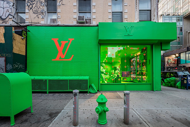 Louis Vuitton открыл поп-ап магазин в Нижнем Ист-Сайде, Нью-Йорк. Осенняя мужская коллекция представлена в тотальном кислотно-зеленом интерьере.