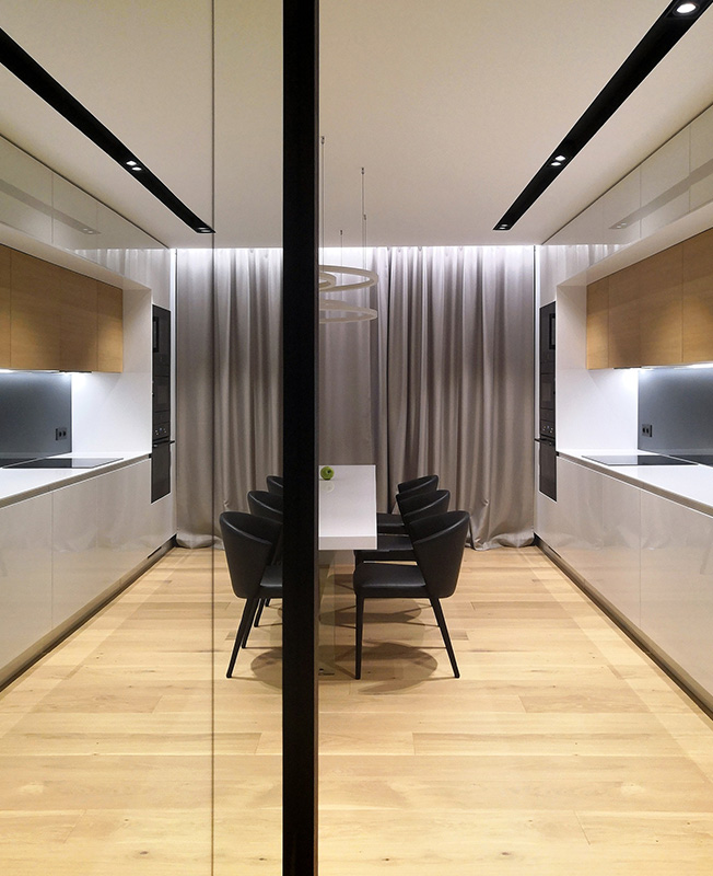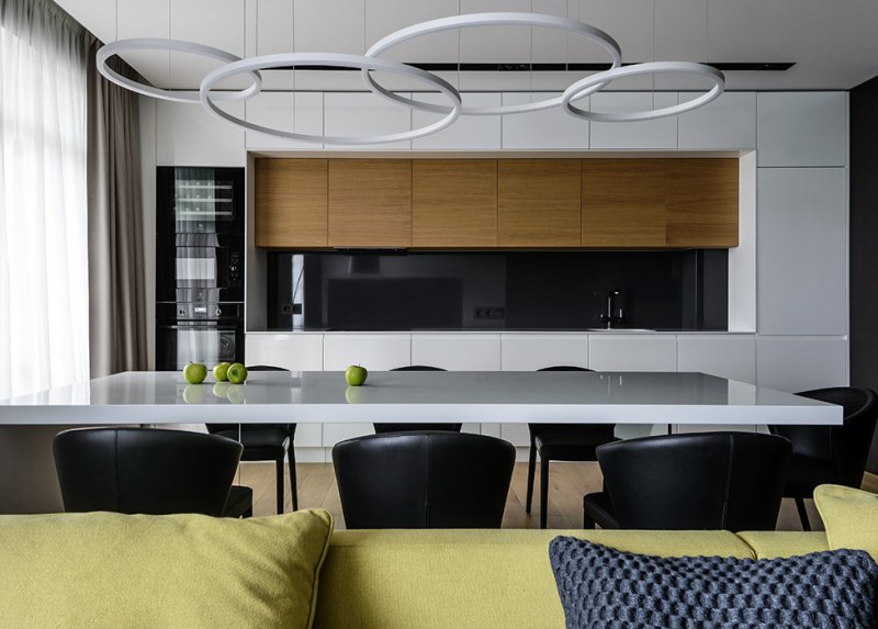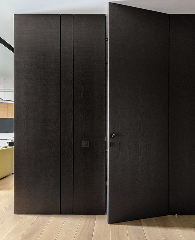 Телевизор и акустика в гостиной встроены в плоскость белой стены. Сабвуфер и дополнительное оборудование — спрятаны в навесном шкафчике. Это сделано для того, чтобы свести к минимуму присутствие технических элементов. Телевизор изначально был куплен с серебристой рамкой. Казалось бы мелочь, но для авторов она стала была серьезной проблемой — терялся смысл задуманного. К счастью, удалось найти мастеров, которые перетянули его черной пленкой.