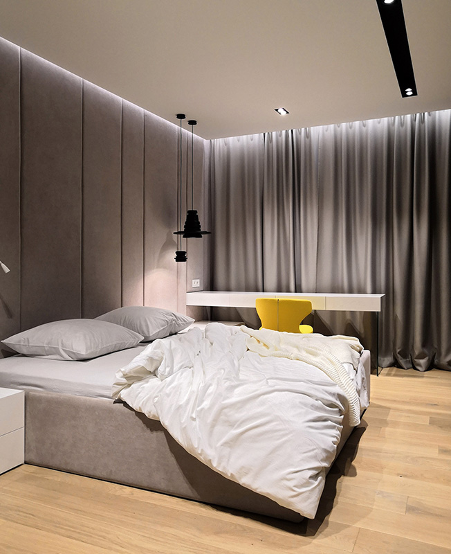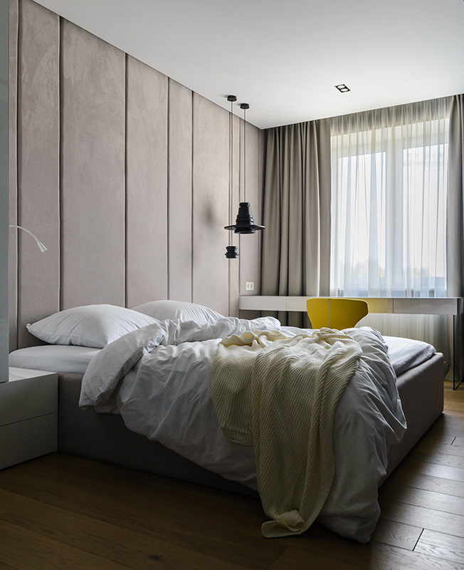 Основные материалы: паркетная дубовая доска светлого приглушенного оттенка, серая краска на стенах, белый лак в мебели, мягкие текстильные панели, панели в шпоне винно-коричневого оттенка с рельефом — они имеют разбивку разной ширины, что создает интересную текстуру.