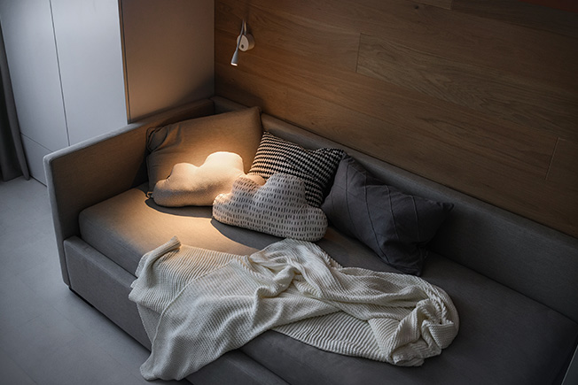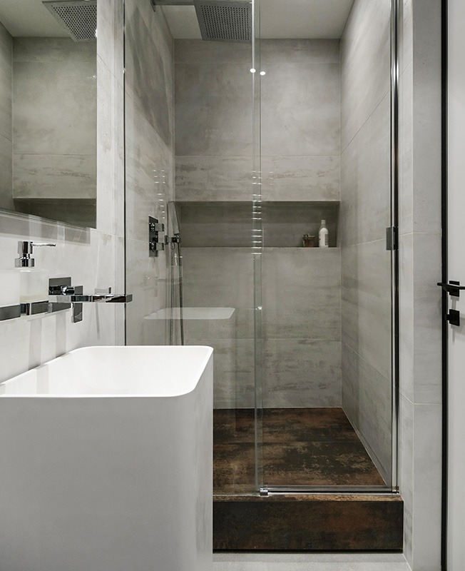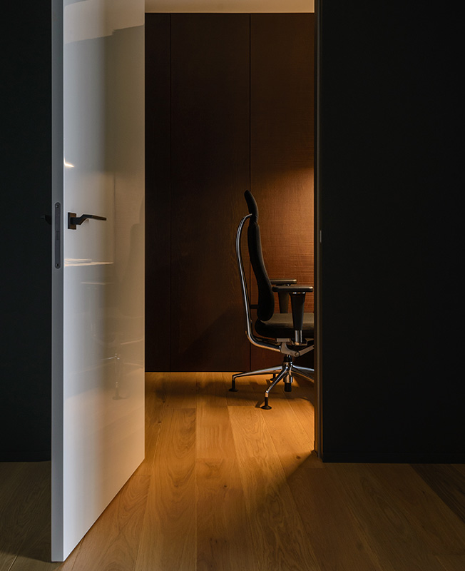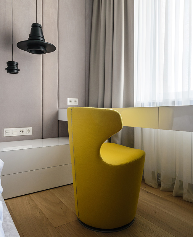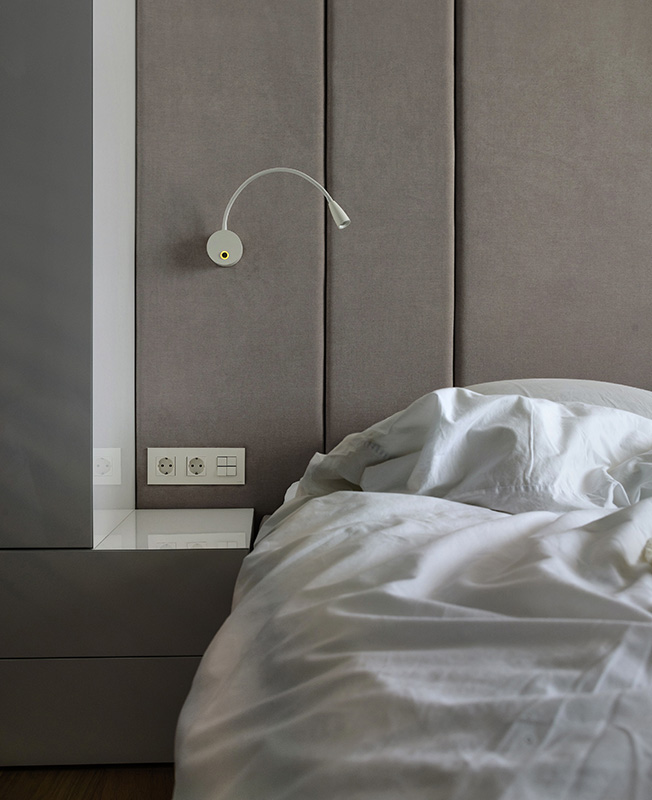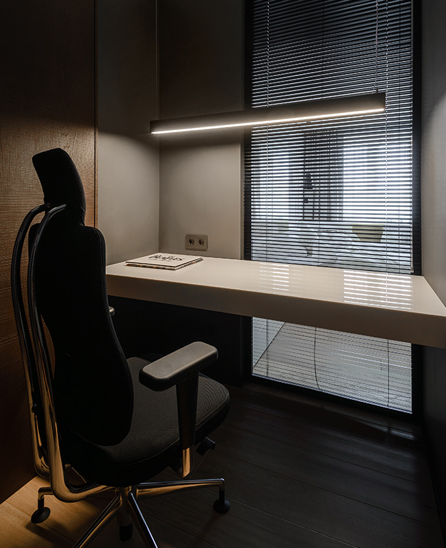Рядом со спальней располагается гардеробная, в которой по настоянию заказчика разместили рабочий стол — получился кабинет. Через стеклянную перегородку из спальни в него проникает естественный свет. При желании можно закрыться горизонтальными жалюзи и никому не мешать.