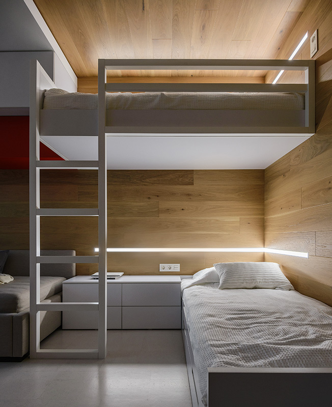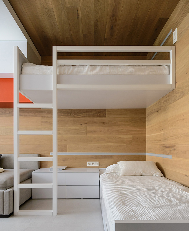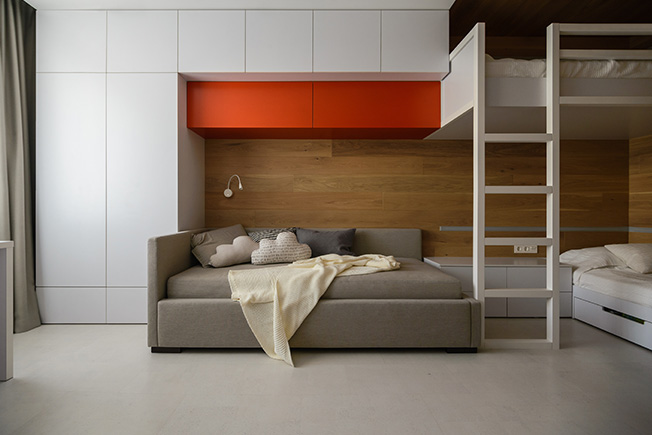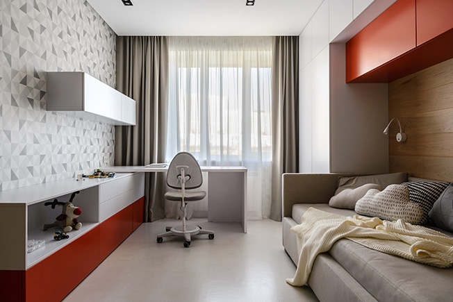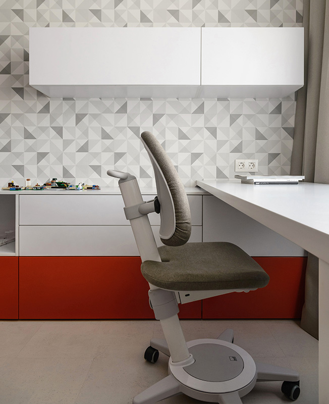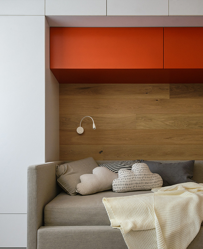 В детской, по желанию заказчика, добавили насыщенный оттенок оранжевого. Напольная паркетная доска переехала на стены и потолок, а на полу появилось пробковое покрытие. Остальные стены заняли обои с геометрическим рисунком марки Eco.