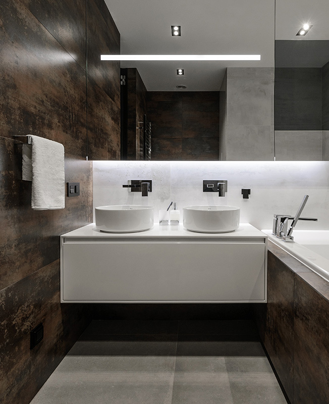 В ванной комнате уместились две раковины, двухместная ванна, постирочный блок за дверцами, унитаз. Напротив ванны в зеркало встроили телевизор, чтобы детям было веселее купаться. Гостевой санузел оснастили душем. Использованы керамогранит Apavisa, Forma, Italgraniti, сантехника Roca, Riho, NS Bath.