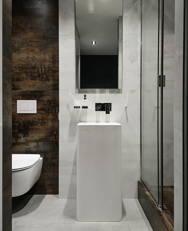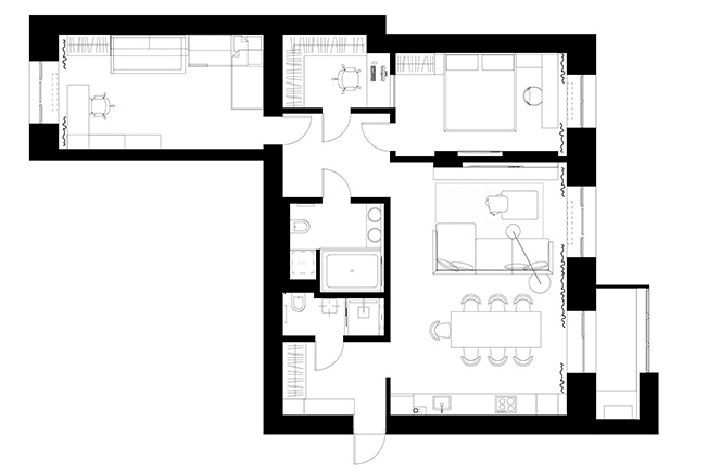 В квартире площадью 100 кв. метров три основных помещения: гостиная-кухня-столовая, спальня родителей и детская, а также санузлы и отдельная гардеробная, в которой выгорожен кабинет. В изначальную планировку внесли изменения: расширили блок санузлов, так, чтобы их вместилось два — гостевой и хозяйский.