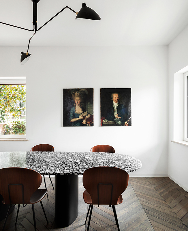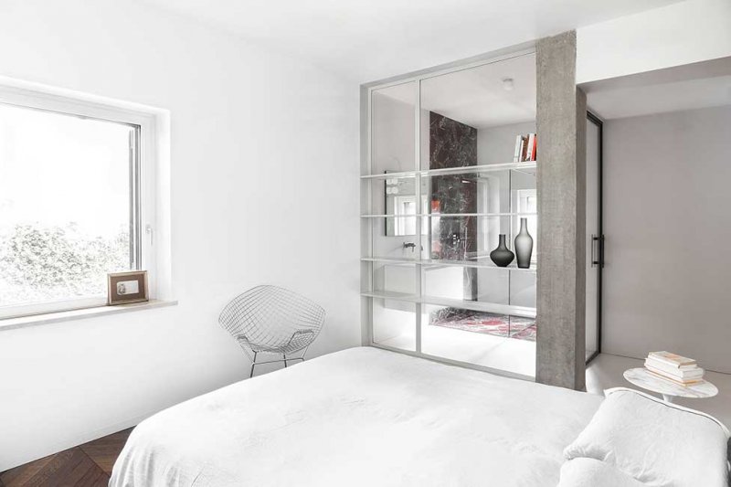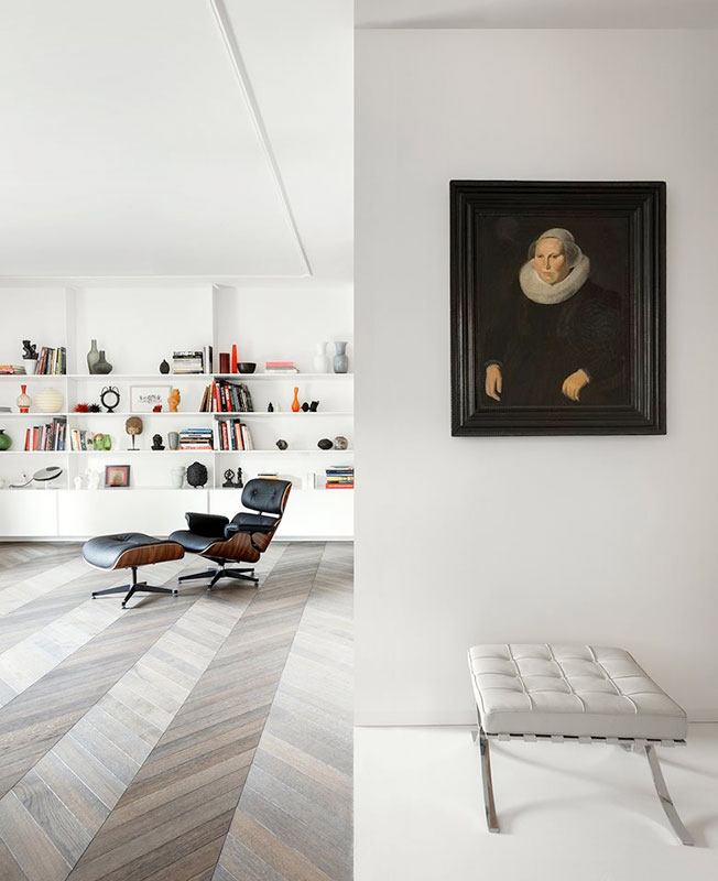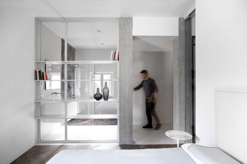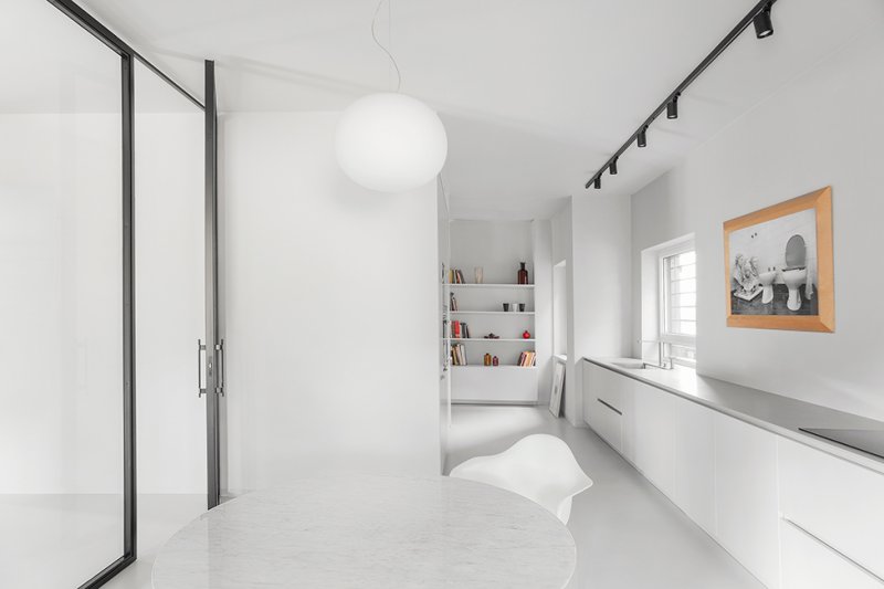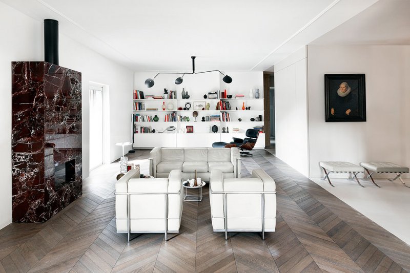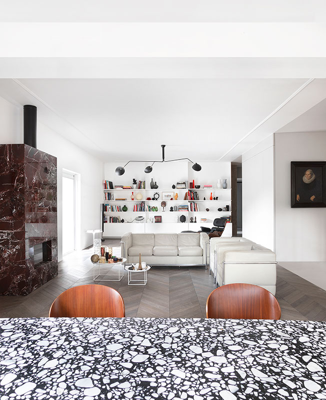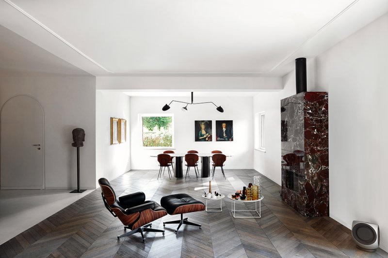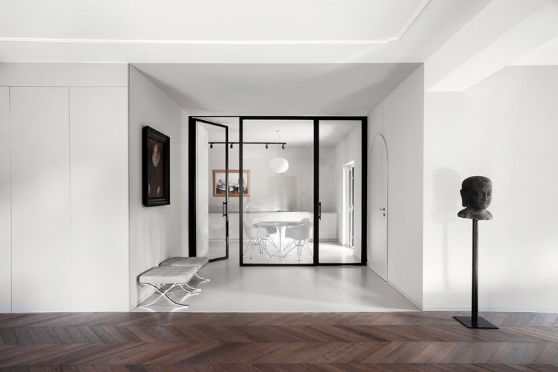 Архитекторы Мохамед Кейлани и Клаудия Фамильетти, студия MGK Architects, обновили интерьер римской квартиры, расположенной в историческом районе Старой Аппиевой дороги. Их задачей было «превратить нечто традиционное во что-то неожиданное». Авторы проекта отталкивались от необходимости разместить хозяйскую коллекцию произведений искусства и мебели, в которую вошли культовые объекты дизайна XX века: кресло Lounge Chair Чарльза и Рэй Имз, пуфы Barcelona Людвига Мис ван дер Роэ, кресло Diamond Гарри Бертойи . Интерьер был задуман как нейтральный фон, своего рода контейнер, где предметы предстают главными героями. Между помещениями минимум физических границ. Монохромную кухню от гостиной отделяет полностью стеклянная стена, что должно поощрить обитателей квартиры встречаться и общаться. Минималистичное пространство наполнено естественным светом, который умножают белоснежные стены. Белый фон контрастирует с фактурными материалами — металлом, древесиной, бетоном и мрамором, — образуя своеобразный микс, в котором приметы «классических» интерьеров чередуются с современными элементами. Отдать дань прошлому помогают отреставрированные винтажные предметы мебели и декора — от стульев до портретов в рамах. В гостиной архитекторы переосмысливают традиционный паркет и красный мрамор, предлагая взглянуть на них через призму сегодняшнего дня. С помощью напольного покрытия обозначили зону гостиной, а мрамором с выразительным узором облицован нарочито лаконичный камин.