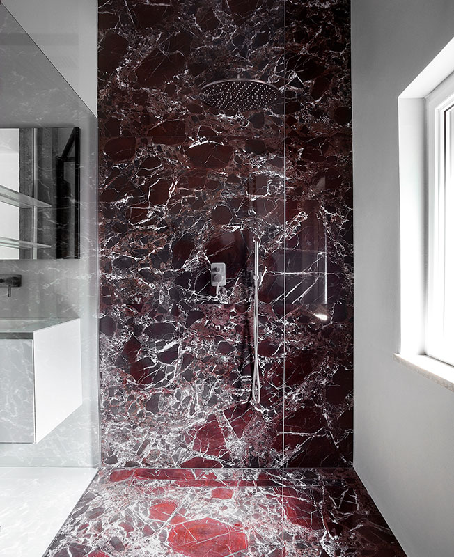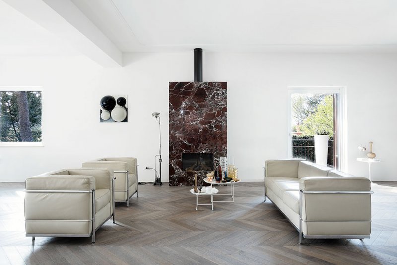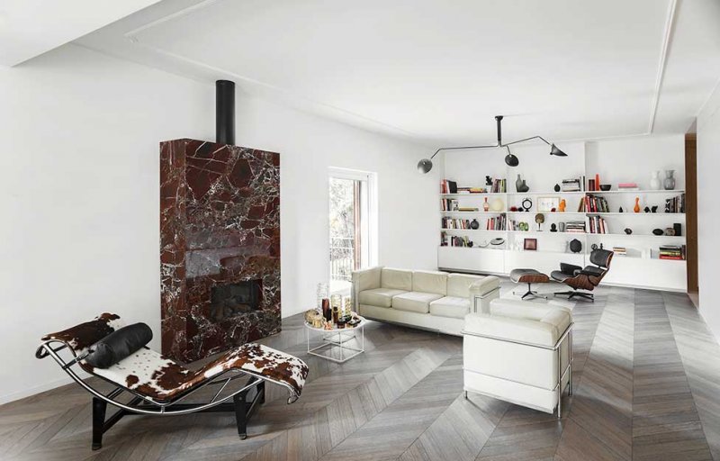 В гостиной архитекторы переосмысливают традиционный паркет и красный мрамор, предлагая взглянуть на них через призму сегодняшнего дня. С помощью напольного покрытия обозначили зону гостиной, а мрамором с выразительным узором облицован нарочито лаконичный камин.