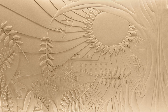 Важную роль играют панели из ореха на стенах. Они выполнены из единого ствола — знаменитого в Англии 300-летнего дерева из Фалбека, упавшего во время урагана 2007 года. То есть специально для проекта деревья не вырубали — этот факт говорит об экологической ответственности владельцев отеля и дизайнера.