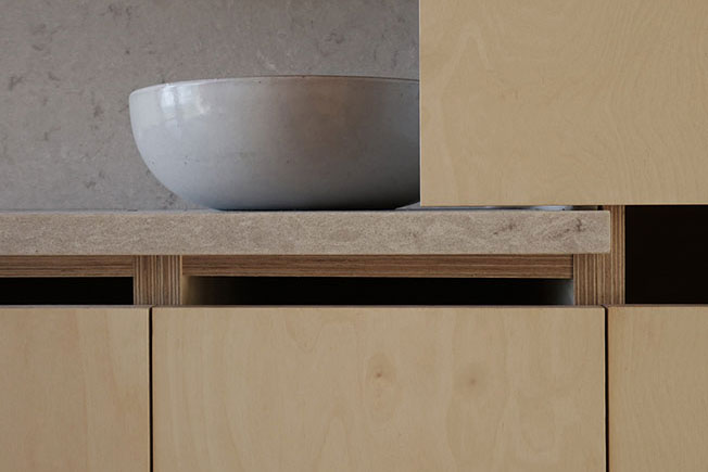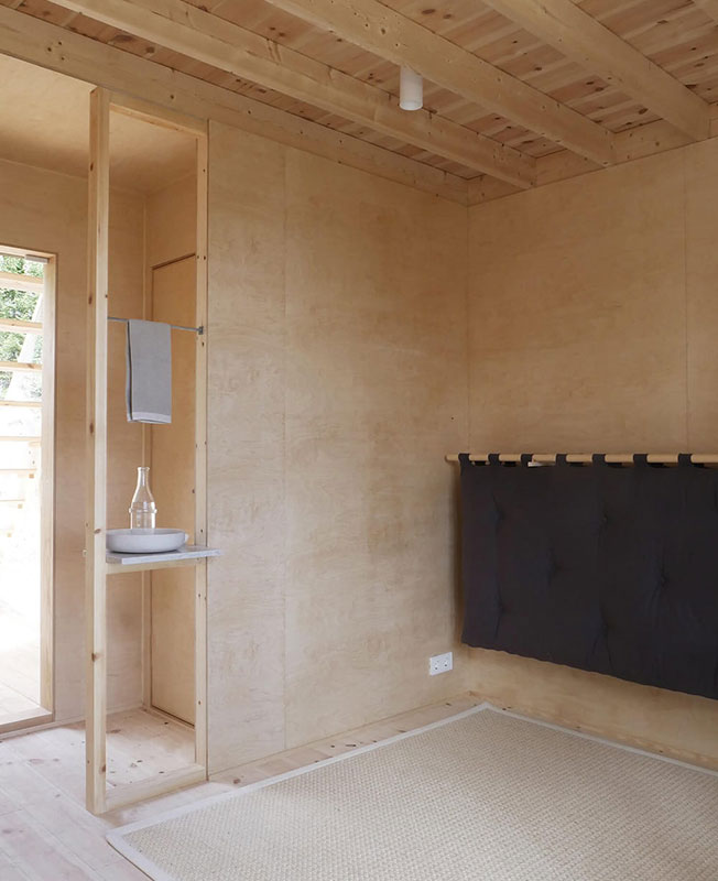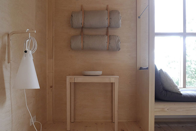 Нижняя комната с климат-контролем, приспособлена для спальни. Столярные изделия из березовой фанеры и ясеня с изоляцией из льноволокна, обеспечивают приятный климат в помещениях.