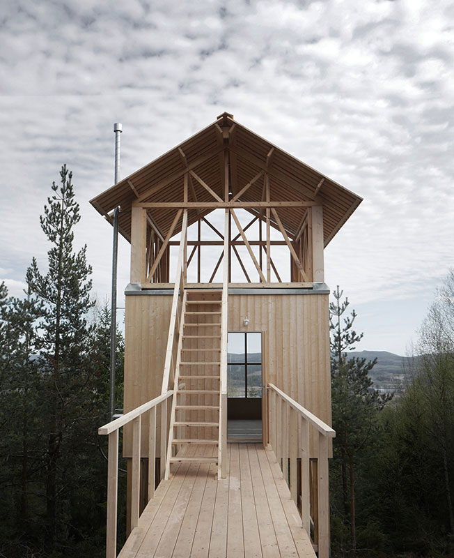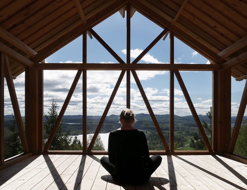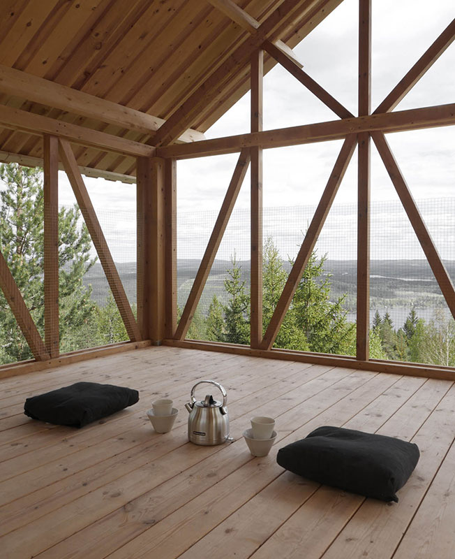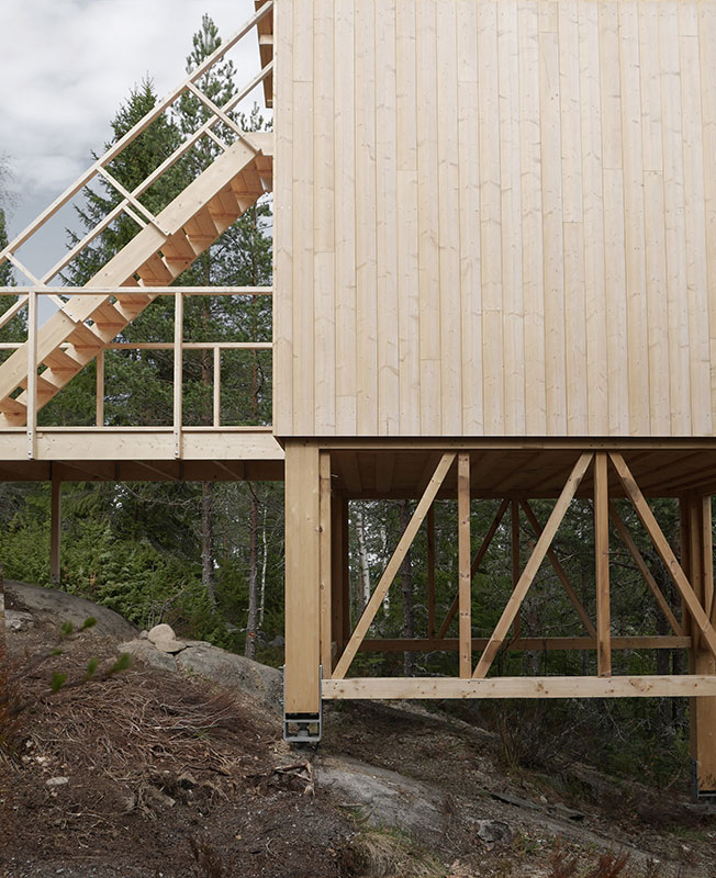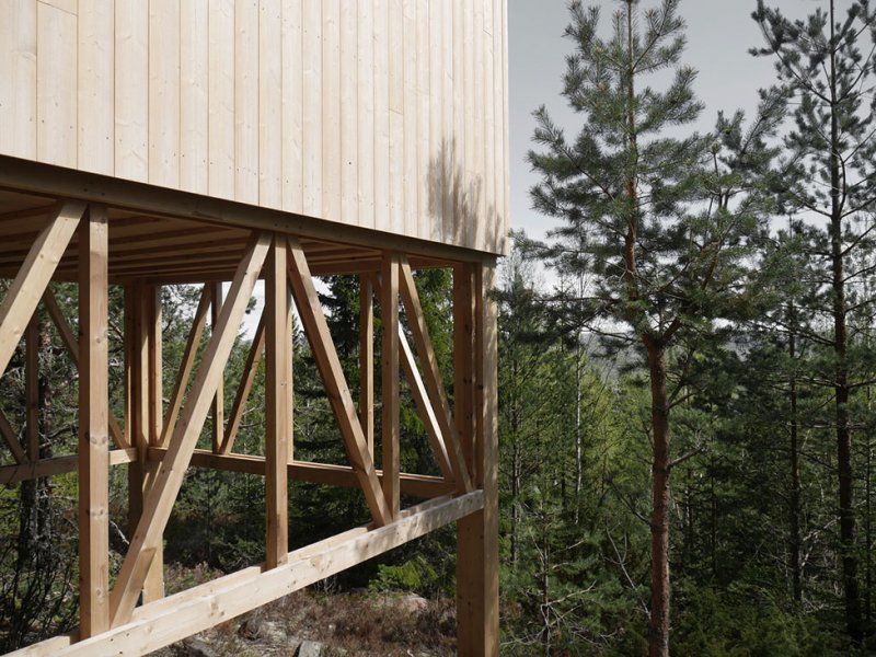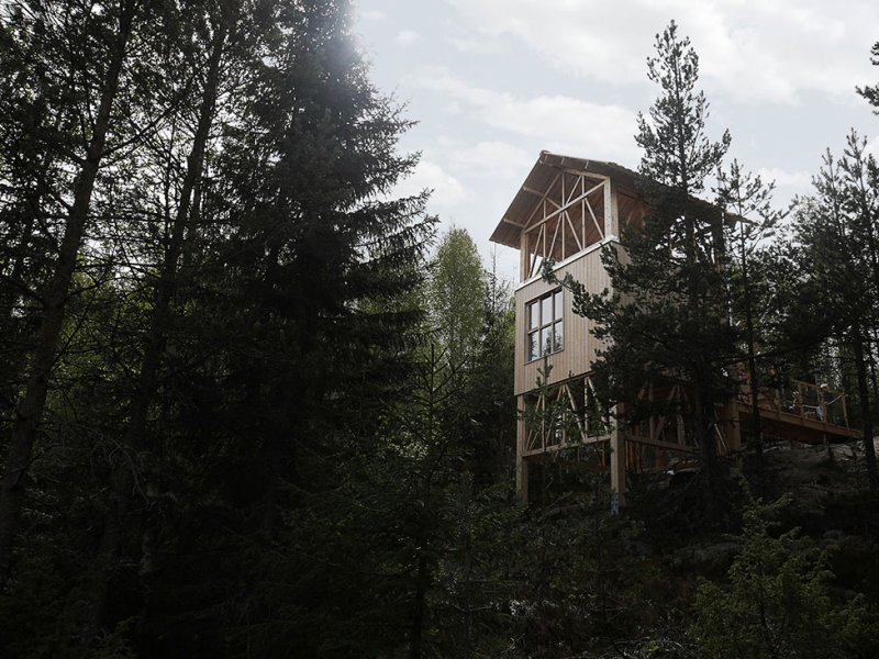 Дом-убежище построен из сосны и ели. Он стоит на сваях на горе и его обширная терраса возвышается над верхушками деревьев. Всего таких «кабин» под именем Bergaliv Landscape Hotel создано четыре.