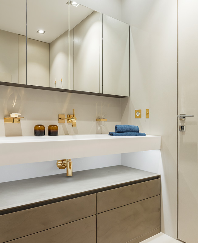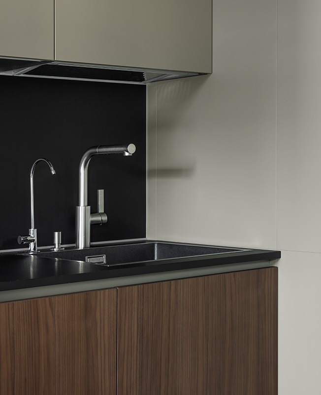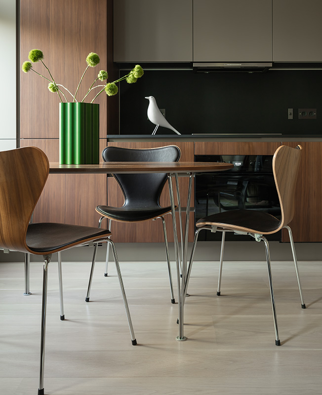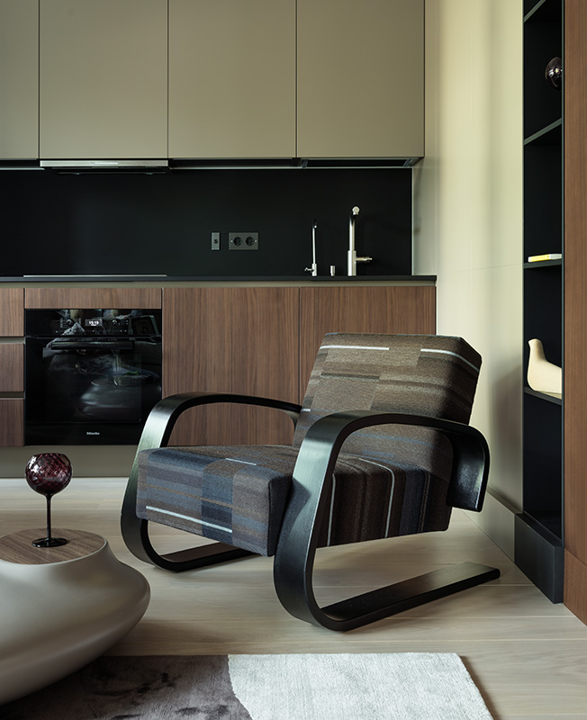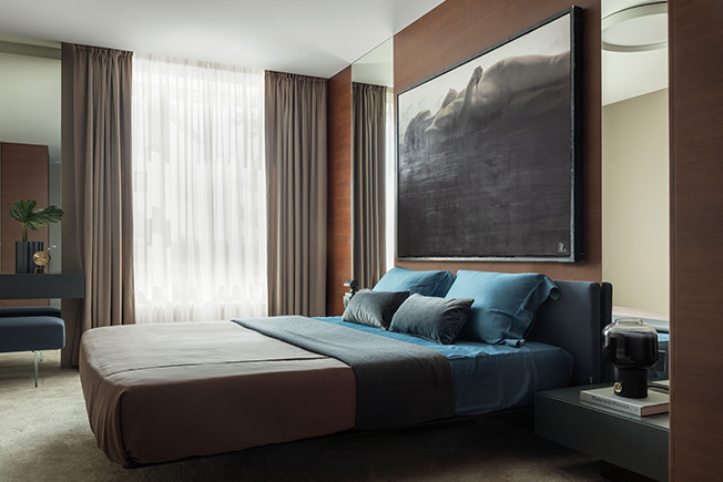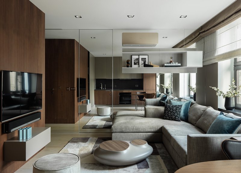 Архитектор приложил усилия, чтобы квартира казалась больше и просторнее. Активно использовал зеркала. Они создают игру отражений в гостиной и маскируют дверь в детскую, визуально увеличивают спальню, раздвигают коридор. Отделка фасадов кухни Poliform повторена на примыкающих стеновых панелях — этот прием также расширяет пространство.
