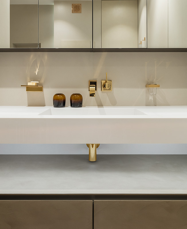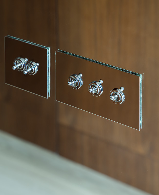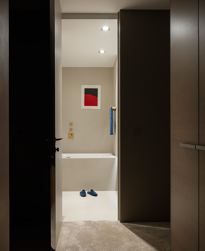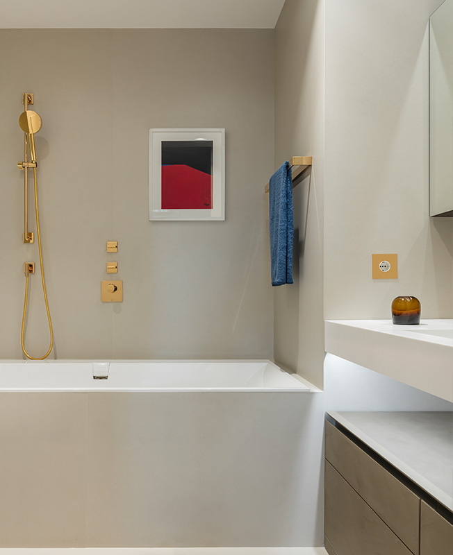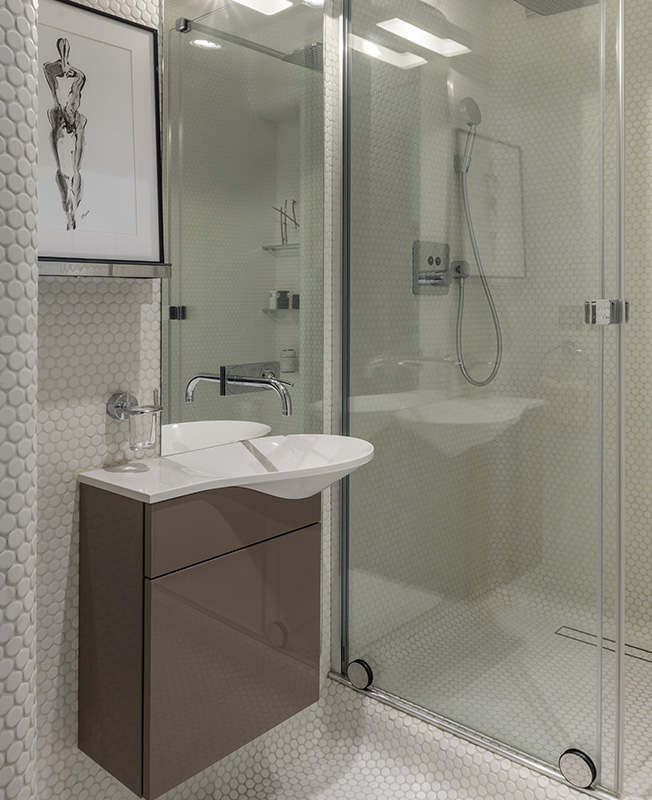 Особое внимание архитектор уделил инженерии, применив нестандартные решения. Так, для окон он взял греющее стекло: оно не выпускает тепло зимой и предохраняет от жары летом, терморегуляторы управляют нагревом в автоматическом режиме. Магнитные плинтусы позволяют легко добраться до проводов и коммуникаций. Вместо радиаторов под окнами установлены экономящие место конвекторы, система кондиционирования встроена в отделанную зеркалом стену.