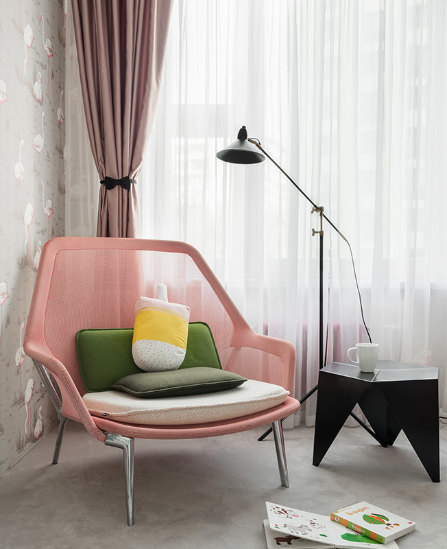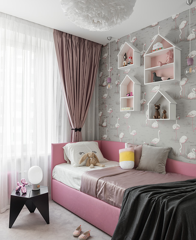 Интерьер выдержан в природой палитре — коричневых, сероватых, оливковых тонах. Исключение сделали для детской: девочки обитают в розовой комнате с фламинго на обоях. Материалы преобладают натуральные: на стенах панели в шпоне американского ореха, на полу массивная дубовая доска.