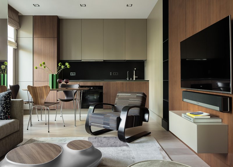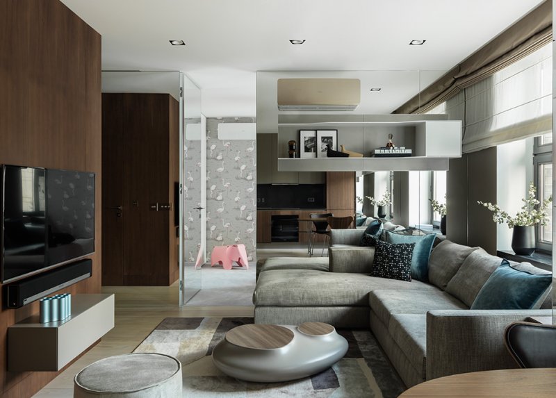 Архитектор Иван Качалов спроектировал квартиру в новом доме — заказчиком на этот раз выступил он сам. Площадь квартиры 70 кв. метров — не так уж много, но Иван продумал каждый сантиметр. Самые интересные интерьеры — те, что архитекторы и дизайнеры создают для себя. Во-первых, здесь они не зависят от прихотей чужого вкуса, во-вторых, часто рассматривают собственные дома и квартиры как поле для экспериментов — чтобы потом с уверенностью предлагать те или иные решения своим клиентам. nonehttps://www.instagram.com/kachalov_ivan/?hl=ruhttps://www.facebook.com/Архстрой-402853183527521http://archstroi.ru/ Получившееся пространство, по убеждению архитектора, не уступает по эргономичности 150-метровым квартирам. В семье подрастают две маленькие дочери — внимательный отец уделил первостепенной внимание их безопасности. Квартира имеет вытянутую асимметричную форму, но поскольку все углы прямые, ее удалось разделить на комнаты комфортной правильной формы. В одном крыле расположили опен спейс гостиной-кухни-столовой, к которому примыкает детская комната, в другом — апартаменты хозяев, включающие спальню, ванную и гардеробную. Окна выходят на две стороны. Из-за большой глубины квартиры в середине образовалась зона, куда попадает мало дневного света. Архитектор спланировал пространство так, чтобы здесь оказались санузлы, гардеробные, прихожая. Архитектор приложил усилия, чтобы квартира казалась больше и просторнее. Активно использовал зеркала. Они создают игру отражений в гостиной и маскируют дверь в детскую, визуально увеличивают спальню, раздвигают коридор. Отделка фасадов кухни Poliform повторена на примыкающих стеновых панелях — этот прием также расширяет пространство. Интерьер выдержан в природой палитре — коричневых, сероватых, оливковых тонах. Исключение сделали для детской: девочки обитают в розовой комнате с фламинго на обоях. Материалы преобладают натуральные: на стенах панели в шпоне американского ореха, на полу массивная дубовая доска. Особое внимание архитектор уделил инженерии, применив нестандартные решения. Так, для окон он взял греющее стекло: оно не выпускает тепло зимой и предохраняет от жары летом, терморегуляторы управляют нагревом в автоматическом режиме. Магнитные плинтусы позволяют легко добраться до проводов и коммуникаций. Вместо радиаторов под окнами установлены экономящие место конвекторы, система кондиционирования встроена в отделанную зеркалом стену.