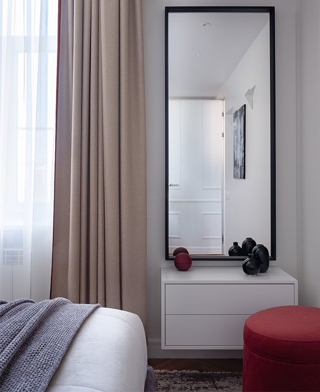 Тумба выполнена на заказ по эскизам дизайнера. Зеркало, Ikea. Текстильное оформление окон, TaBuDecor.