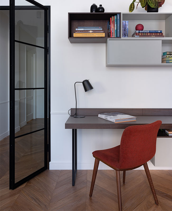 Фрагмент рабочего места. Настольный светильник, Aromas del Campo. Дубовый пол, Finex. Общая зона отделена от гостиной стеклянными перегородками.