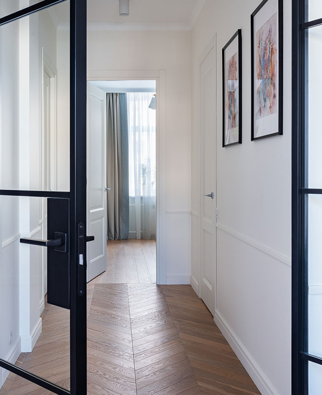 Вид на гостиную из кориддора. Дубовый пол, Finex. Краска, Benjamin Moore.
