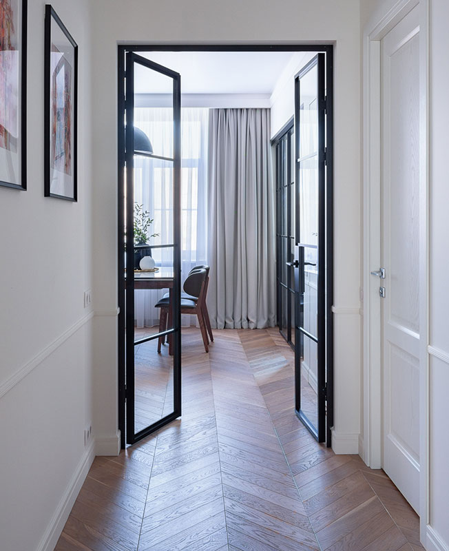 «Организация проходной гостиной стала особенно удачным решением, — рассказывает дизайнер. — В помещение выходят четыре двери, одна из которых скрытого монтажа и полностью сливается со стенами, а остальные — прозрачные стеклянные».