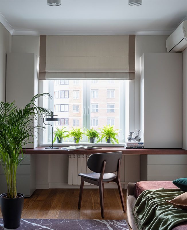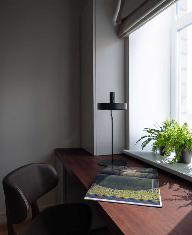Фрагмент рабочего места. Настольный светильник, Aromas del Campo. Текстильное оформление окон, TaBuDecor.