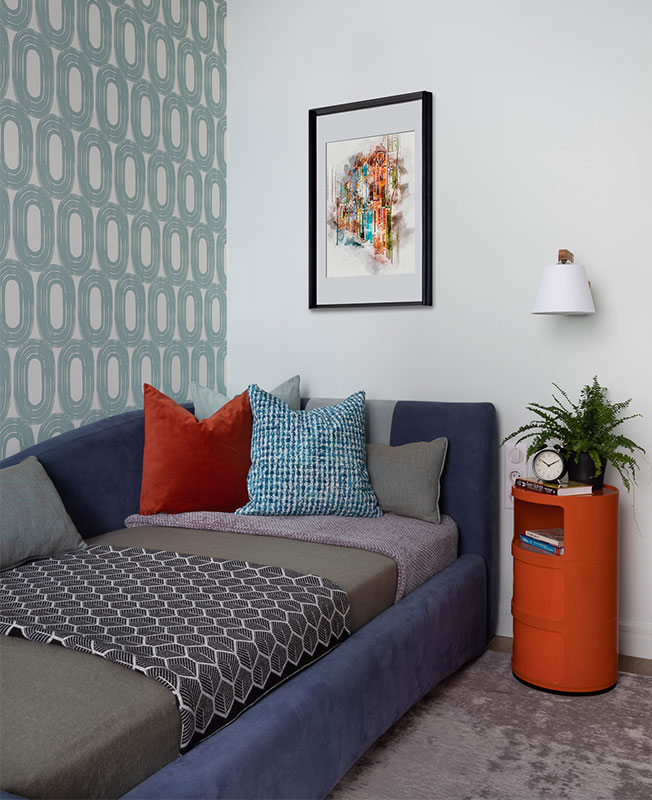 Фрагмент детской. Тумбочка Componibili, Kartell. Кровать, фабрика Infiniti. Ковер, Scanddyy.