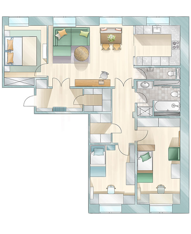 Главным недостатком довольно просторной квартиры 98 кв. метров на Севере Москвы была ее коридорная система. Все четыре комнаты были весьма скромных размеров, но холл занимал почти 20 кв. метров полезной площади. При этом в квартире было целых шесть окон, два из которых выходили на тихий зеленый дворик. Создать грамотную планировку и организовать комфортное пространство для большой семьи пригласили дизайнера Наталью Соло.