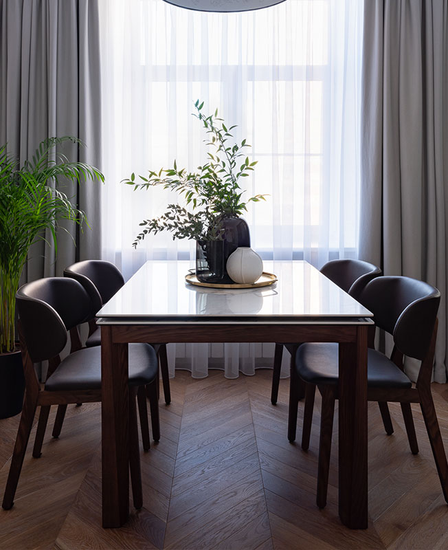 Зона столовой. Обеденный стол и стулья, Calligaris. Дубовый пол, Finex.