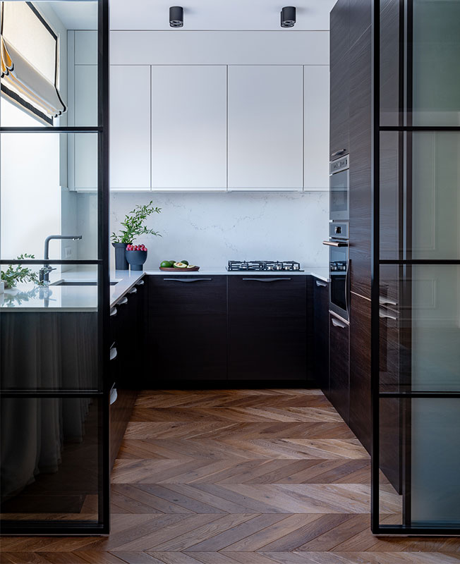 Вход в кухню расположили в гостиной. Газовая плита требовала изоляции, поэтому предпочтение отдали легкими стеклянным перегородкам, которые сохранили визуальное единство кухни-гостиной. Аналогичными перегородками отделили коридор от общественной зоны.