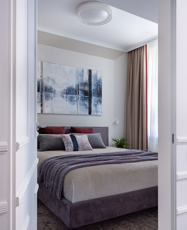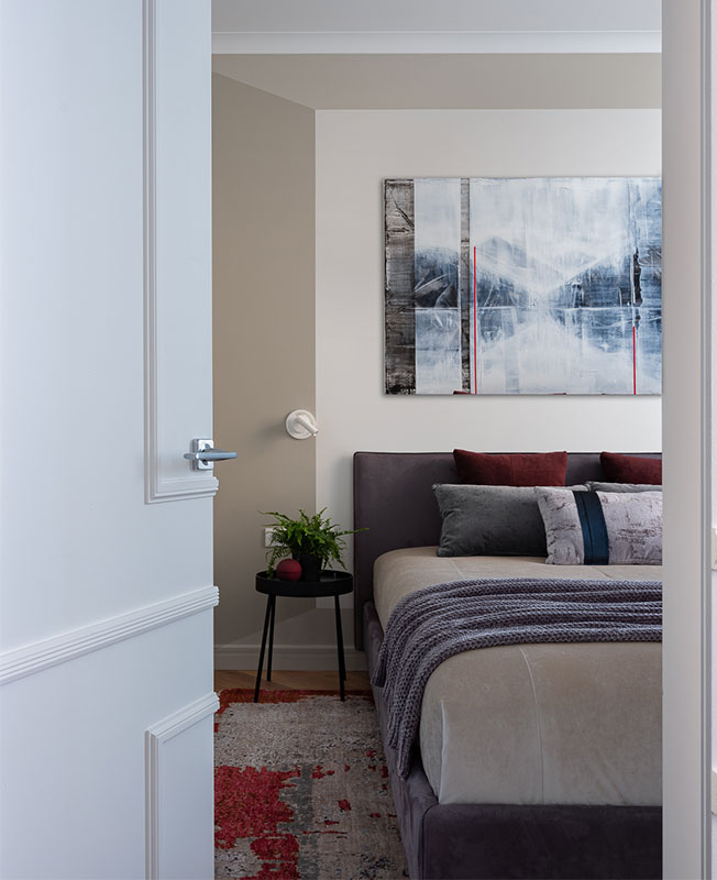 Главная спальня. Кровать выполнена на заказ по эскизам дизайнера. Картина «Пейзаж. Воспоминание о будущей зиме», Софья Пятницкая, галерея Smart.