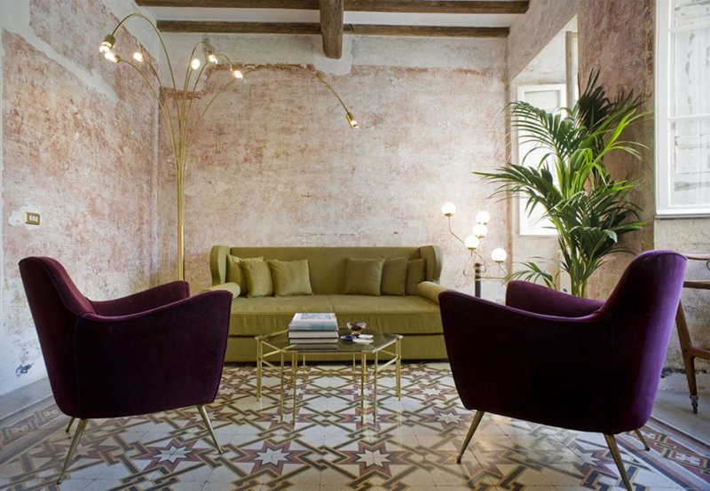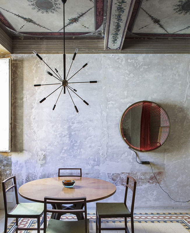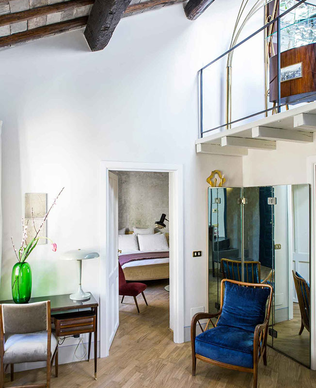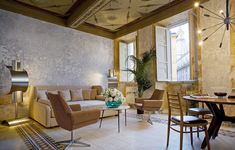 Зеркальные плитки, стены с патиной, современное искусство и итальянская мебель mid-century modern характеризуют обстановку бутик-отеля в римском палаццо XVII века. Габриэле Салини преобразил не просто историческую собственность, а свой семейный дом, которым владело ни одно поколение предков.