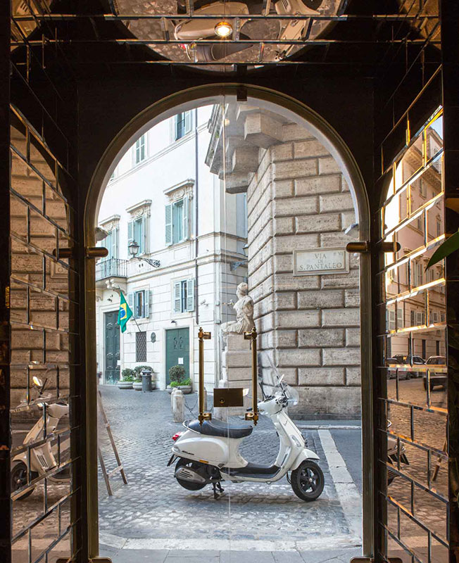 Отремонтированный пятиэтажный отель G-Rough расположен в самом сердце Рима. Здание изначально было построено в 1600-х годах — его 400-летнюю историю демонстрируют оригинальные деревянные потолки и стены, покрытые многочисленными слоями краски. Эти исторические штрихи компенсируются современным искусством и мебелью середины XX века. Ванные комнаты отеля, кафе и лобби покрыты зеркальной плиткой из серебра и золота.