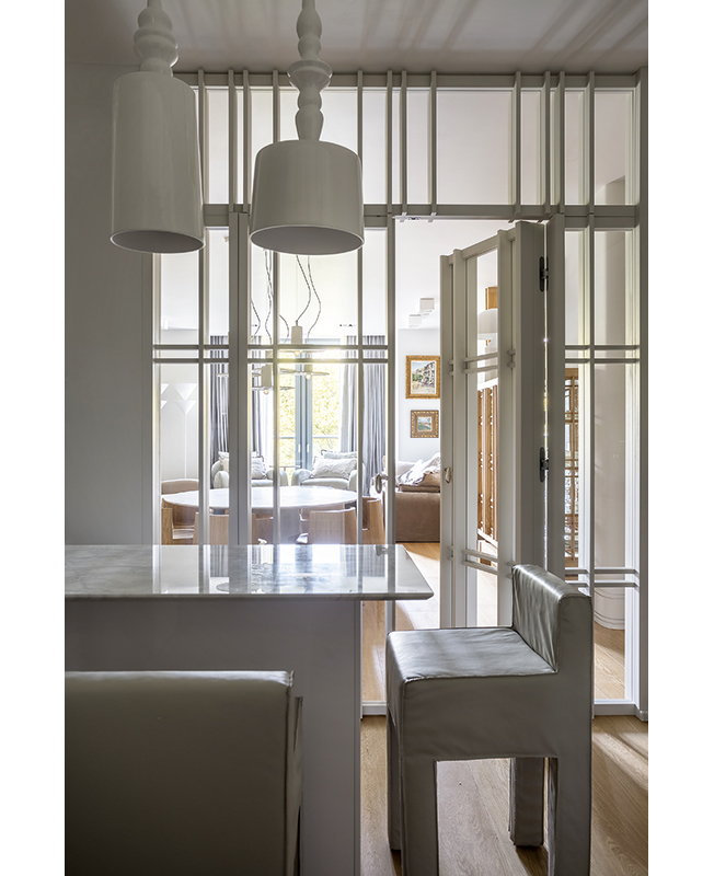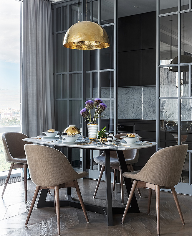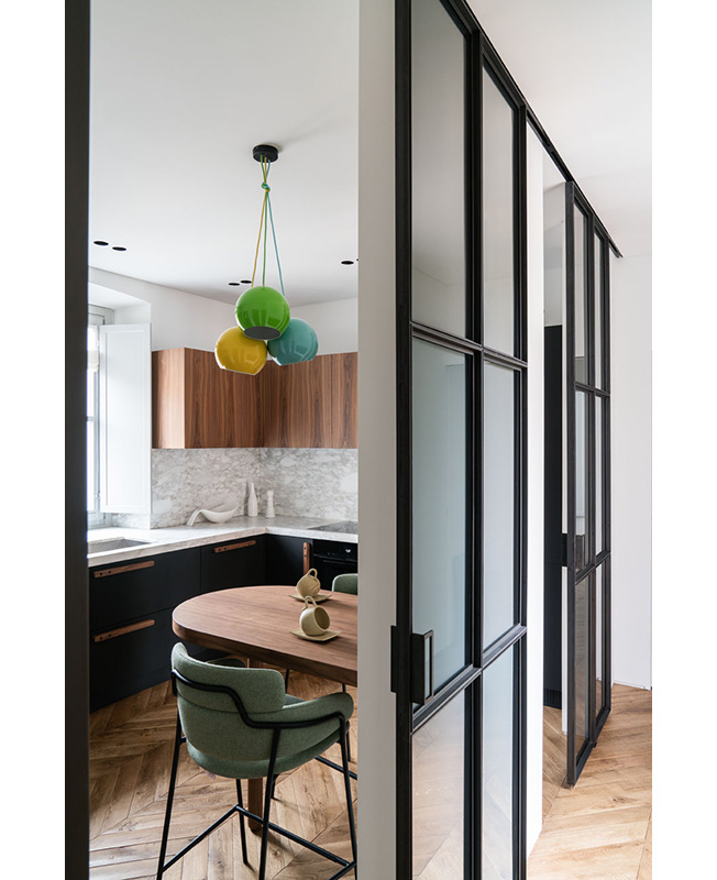 Наталья Соло: перепланировка квартиры для семьи с двумя детьми. Вид из гостиной на кухню. Зоны отделены друг от друга стеклянными сдвижными перегородками. Обеденные стулья, Calligaris.