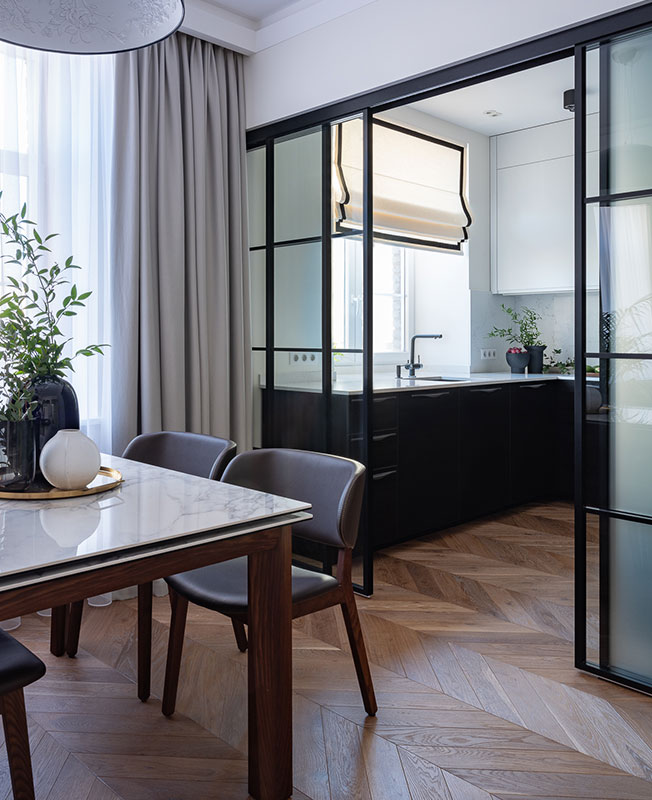 Ольга Энгель. Огромные окна — украшение квартиры в современном доме. Прозрачная перегородка позволяет солнечному свету проникать через гостиную-столовую в кухню. Максимальная высота остекления зрительно приподнимает потолки.