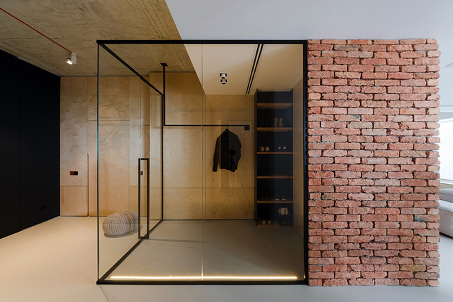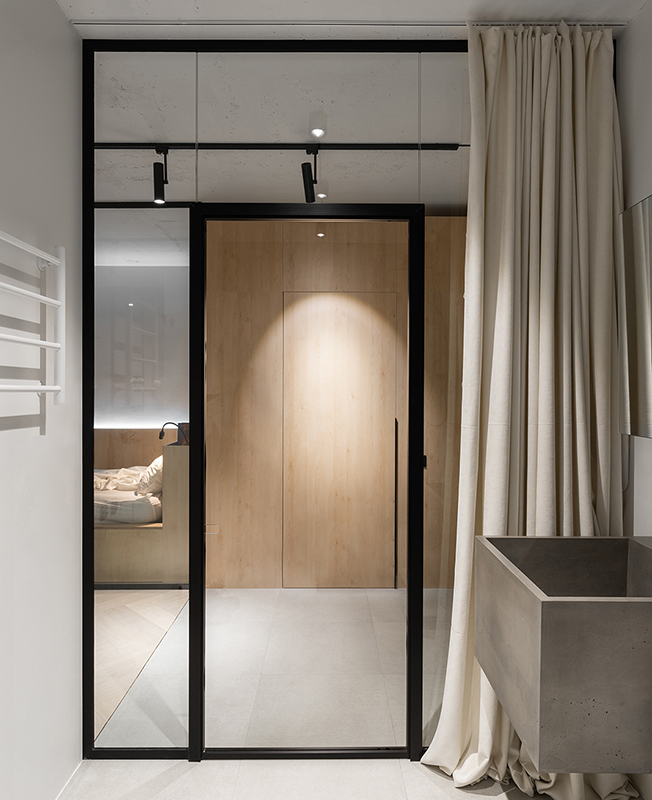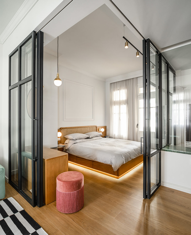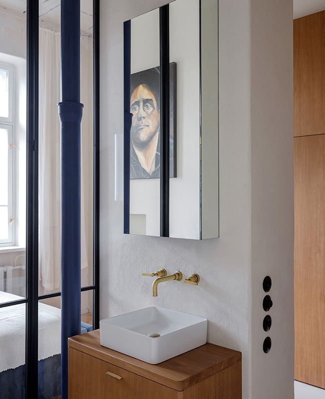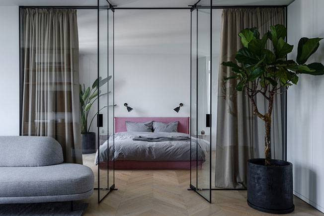 Эмиль Дервиш: ностальгическая квартира для режиссера. Стеклянная перегородка между спальней и ванной обеспечивает доступ дневного света.