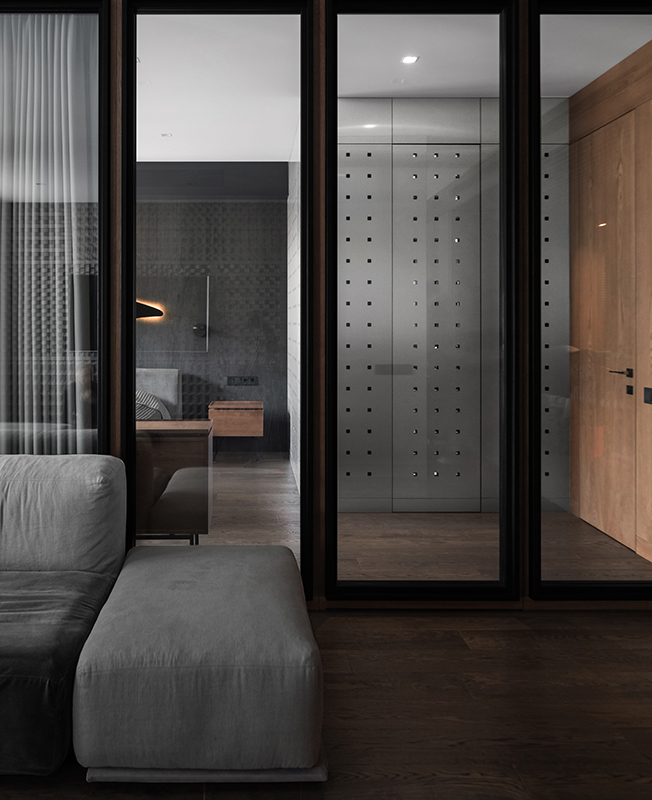 Проект MS-A в Петербурге: квартира с тайниками. Прозрачная стеклянная стена между гостиной и спальней состоит из шести стеклопакетов, один из которых является дверью, и дополнена шторой, управляемой с обеих сторон. Диван Pianca.