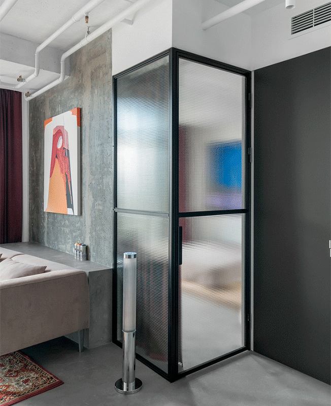 Зонируют такими перегородками не только гостиные, столовые и кухни. При помощи лофт-перегородки можно выделить в небольшой квартире спальное место, гардеробную. Еще один эффектный вариант — использовать для ванной комнаты, отгораживая ее целиком или только отдельный душевой отсек.